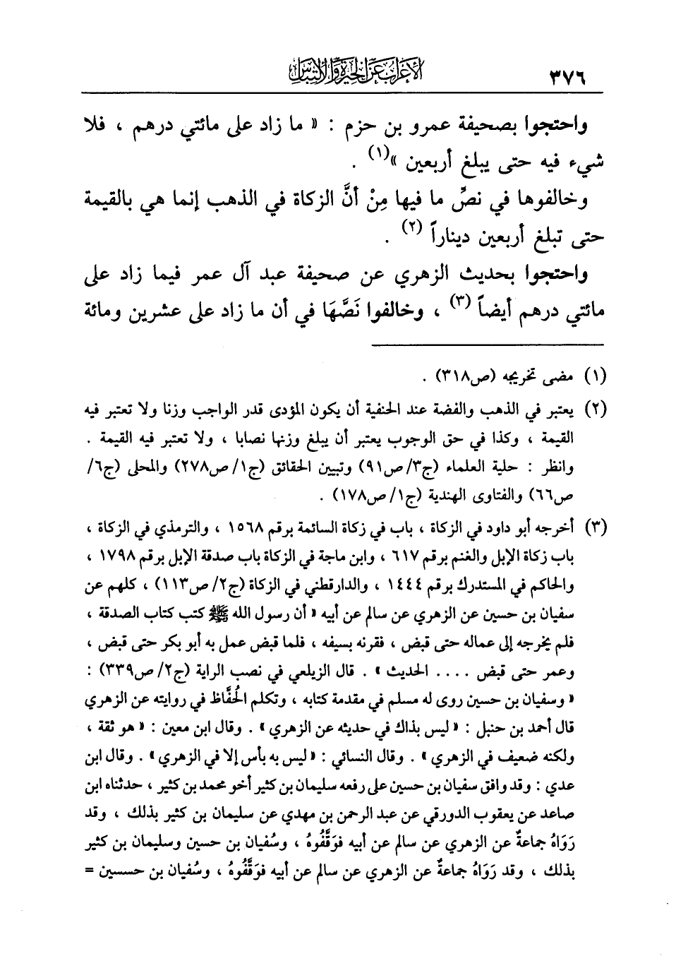 واحتجوا بحديث الزهري عن صحيفة عبد آل عمر فيما زاد على مائتي درهم أيضًا (¬٣)، وخالفوا نَصَّهَا في أن ما زاد على عشرين ومائة