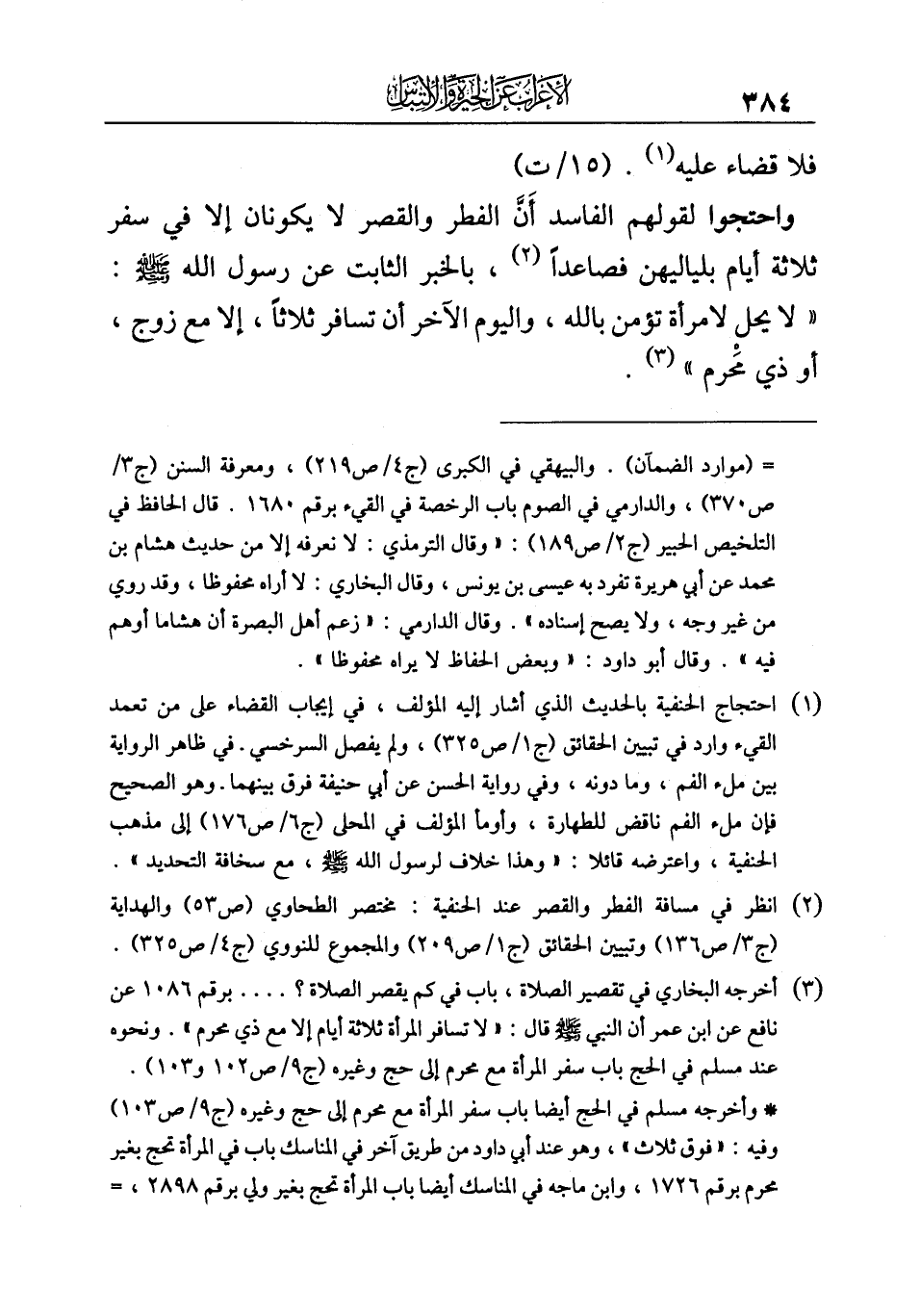واحتجوا لقولهم الفاسد أَنَّ الفطر والقصر لا يكونان إلا في سفر ثلاثة أيام بلياليهن فصاعدًا (¬٢)، بالخبر الثابت عن رسول الله -صلى الله عليه وسلم-: "لا يحل لامرأة تؤمن بالله، واليوم الآخر أن تسافر ثلاثًا، إلا مع زوج، أو ذي مَحْرم" (¬٣).