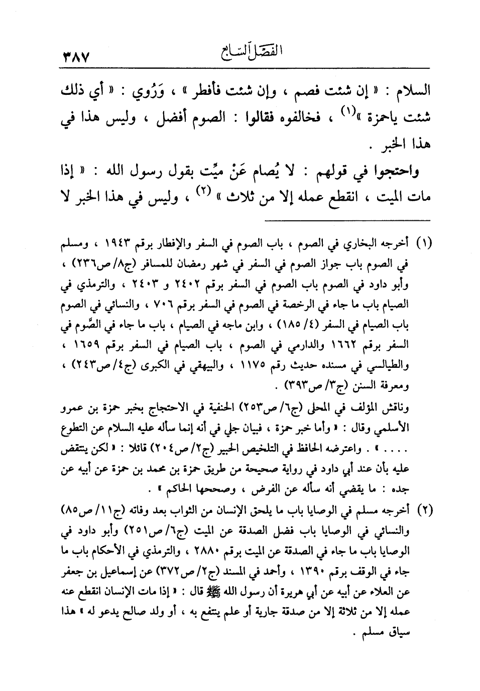 وناقش المؤلف في المحلى (ج ٦/ ص ٢٥٣) الحنفية في الاحتجاج بخبر حمزة بن عمرو الأسلمي وقال: "وأما خبر حمزة، فبيان جلي في أنه إنما سأله عليه السلام عن التطوع .... ". واعترضه الحافظ في التلخيص الحبير (ج ٢/ ص ٢٠٤) قائلا: "لكن ينتقض عليه بأن عند أبي داود في رواية صحيحة من طريق حمزة بن محمد بن حمزة عن أبيه عن جده: ما يقضي أنه سأله عن الفرض، وصححها الحاكم".