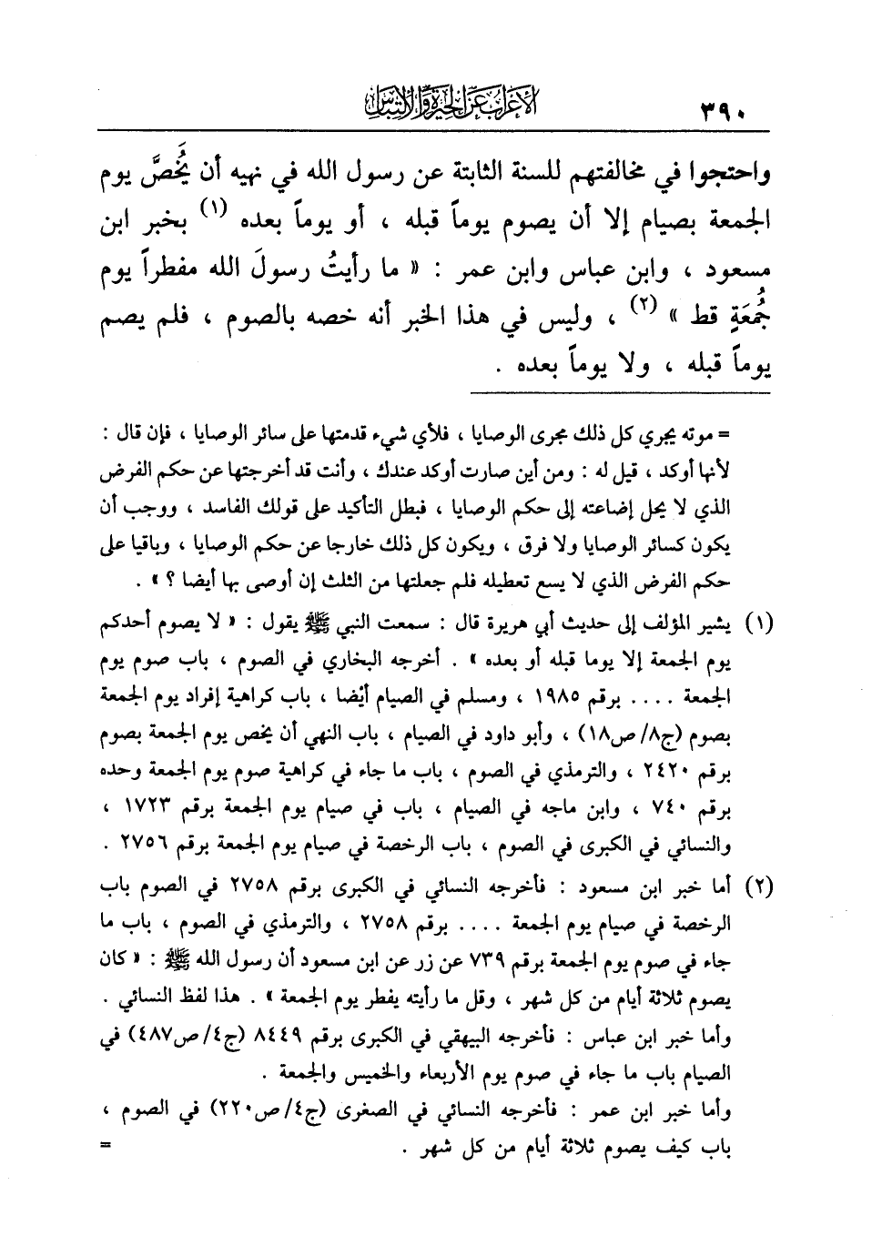 (¬١) يشير المؤلف إلى حديث أبي هريرة قال: سمعت النبي -صلى الله عليه وسلم- يقول: "لا يصوم أحدكم يوم الجمعة إلا يوما قبله أو بعده". أخرجه البخاري في الصوم، باب صوم يوم الجمعة .... برقم ١٩٨٥، ومسلم في الصيام أيْضا، باب كراهية إفراد يوم الجمعة بصوم (ج ٨/ ص ١٨)، وأبو داود في الصيام، باب النهي أن يخص يوم الجمعة بصوم برقم ٢٤٢٠، والترمذي في الصوم، باب ما جاء في كراهية صوم يوم الجمعة وحده برقم ٧٤٠، وابن ماجه في الصيام، باب في صيام يوم الجمعة برقم ١٧٢٣، والنسائي في الكبرى في الصوم، باب الرخصة في صام يوم الجمعة برقم ٢٧٥٦.
