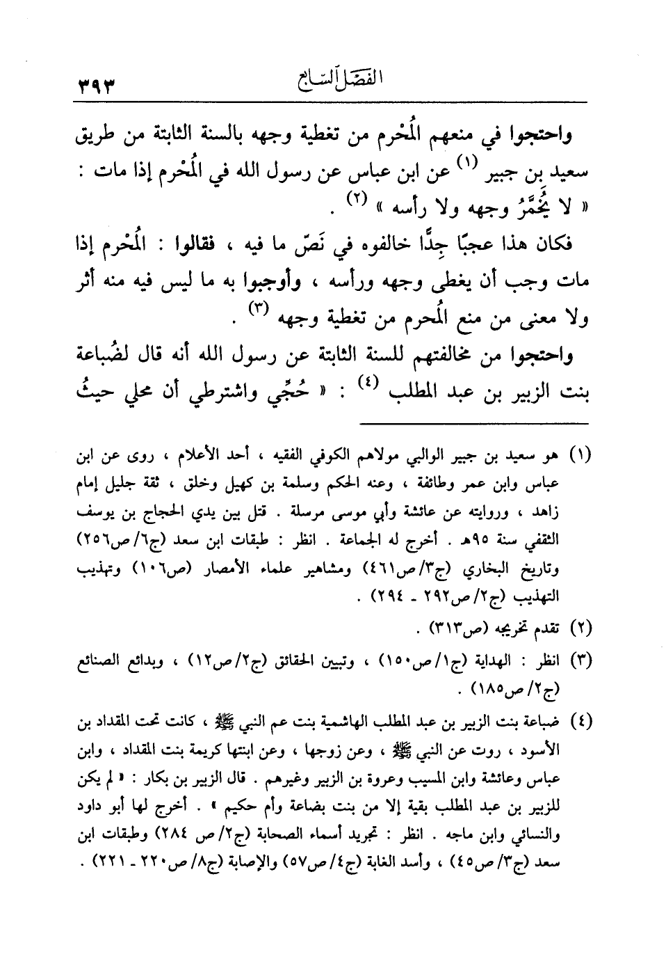 واحتجوا في منعهم المُحْرم من تغطية وجهه بالسنة الثابتة من طريق سعيد بن جبير (¬١) عن ابن عباس عن رسول الله في المُحْرم إذا مات: "لا يُخَمَّرُ وجهه ولا رأسه" (¬٢).