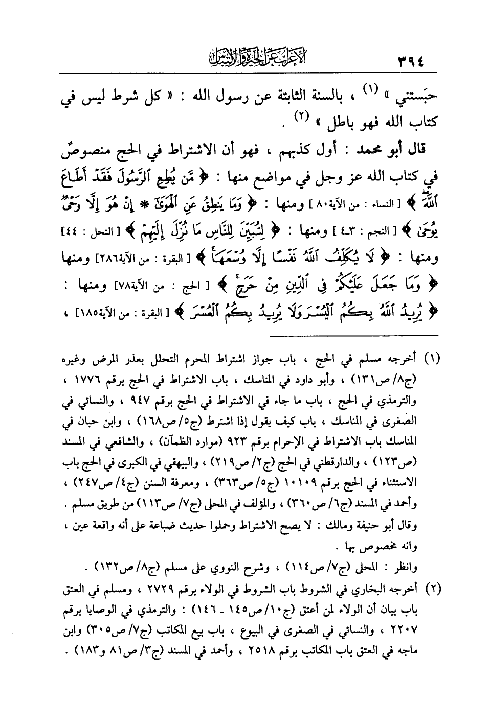 قال أبو محمد: أول كذبهم، فهو أن الاشتراط في الحج منصوصٌ في كتاب الله عز وجل في مواضع منها: {مَنْ يُطِعِ الرَّسُولَ فَقَدْ أَطَاعَ اللَّهَ} [النساء: من الآية ٨٠] ومنها: {وَمَا يَنْطِقُ عَنِ الْهَوَى (٣) إِنْ هُوَ إِلَّا وَحْيٌ يُوحَى} [النجم: ٣ - ٤] ومنها: {لِتُبَيِّنَ لِلنَّاسِ مَا نُزِّلَ إِلَيْهِم} [النحل: ٤٤] ومنها: {لَا يُكَلِّفُ اللَّهُ نَفْسًا إِلَّا وُسْعَهَا} [البقرة: من الآية ٢٨٦] ومنها {وَمَا جَعَلَ عَلَيْكُمْ فِي الدِّينِ مِنْ حَرَجٍ} [الحج: من الآية ٧٨] ومنها: {يُرِيدُ اللَّهُ بِكُمُ الْيُسْرَ وَلَا يُرِيدُ بِكُمُ الْعُسْرَ} [البقرة: من الآية ١٨٥]،