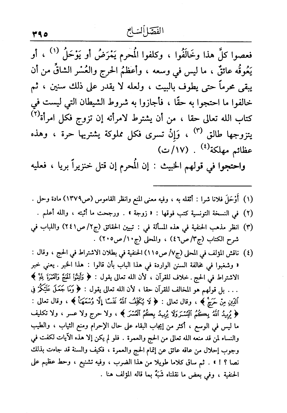 (¬٤) ناقش المؤلف في المحلى (ج ٧/ ص ١١٥) الحنفية في بطلان الاشتراط في الحج، وقال: "وشغبوا في مخالفة السنن الواردة في هذا الباب بأن قالوا: هذا الخبر. يعني خبر الاشتراط في الحج. خلاف للقرآن، لأن الله تعالى يقول: {وَأَتِمُّوا الْحَجَّ وَالْعُمْرَةَ لِلَّهِ} ... بل قولهم هو المخالف للقرآن حقا، لأن الله تعالى يقول: {وَمَا جَعَلَ عَلَيْكُمْ فِي الدِّينِ مِنْ حَرَجٍ}، وقال تعالى: {لَا يُكَلِّفُ اللَّهُ نَفْسًا إِلَّا وُسْعَهَا}، وقال تعالى: {يُرِيدُ اللَّهُ بِكُمُ الْيُسْرَ وَلَا يُرِيدُ بِكُمُ الْعُسْرَ}، ولا حرج ولا عسر، ولا تكليف ما ليس في الوسع، أكثر من إيجاب البقاء على حال الإحرام ومنع الثياب، والطيب والنساء لمن قد منعه الله تعالى من الحج والعمرة. فلو لم يكن إلا هذه الآيات لكفت في وجوب إحلال من عاقه عائق عن إتمام الحج والعمرة، فكيف والسنة قد جاءت بذلك نصا؟ ! ". ثم ساق كلاما طويلا من هذا الضرب، وفيه تشنيع، وحط عظيم على الحنفية، وفي بعض ما نقلناه شَبَهٌ بما قاله المؤلف هنا.