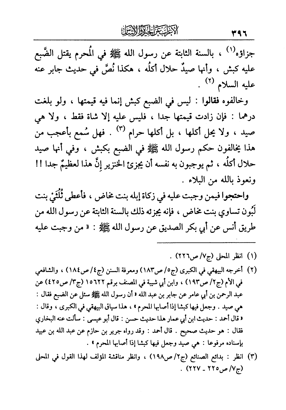 (¬٢) أخرجه البيهقي في الكبرى (ج ٥/ ص ١٨٣) ومعرفة السنن (ج ٤/ ص ١٨٤)، والشافعي في الأم (ج ٢/ ص ١٩٣)، وابن أبي شيبة في المصنف برقم ١٥٦٢٢ (ج ٣/ ص ٤٢٥) عن عبد الرحمن بن أبي عامر عن جابر بن عبد الله "أن رسول الله -صلى الله عليه وسلم- سئل عن الضبع فقال: هي صيد. وجعل فيها كبشا إذا أصابها المحرم"، هذا سياق البيهقي في الكبرى، وقال: "قال أحمد: حديث ابن أبي عمار هذا حديث حسن: قال أبو عيسى: سألت عنه البخاري فقال: هو حديث صحيح. قال أحمد: وقد رواه جرير بن حازم عن عبد الله بن عبيد بإسناده مرفوعا: هي صيد وجعل فيها كبشا إذا أصابها المحرم".
