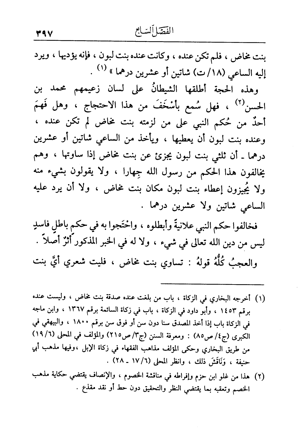 وهذه الحجة أطلقها الشيطانُ على لسان زعيمهم محمد بن الحسن (¬٢)، فهل سُمع بأسْخَفَ من هذا الاحتجاج، وهل فَهمَ أحدٌ من حُكم النبي على من لزمته بنت مخاض لم تكن عنده، وعنده بنت لبون أن يعطيها، ويأخذ من الساعي شاتين أو عشرين درهما - أن ثلثي بنت لبون يجزئ عن بنت مخاض إذا ساوتها، وهم يخالفون هذا الحكم من رسول الله جِهارا، ولا يقولون بشيء منه ولا يجُيزون إعطاء بنت لبون مكان بنت مخاض، ولا أن يرد عليه الساعي شاتين ولا عشرين درهما.