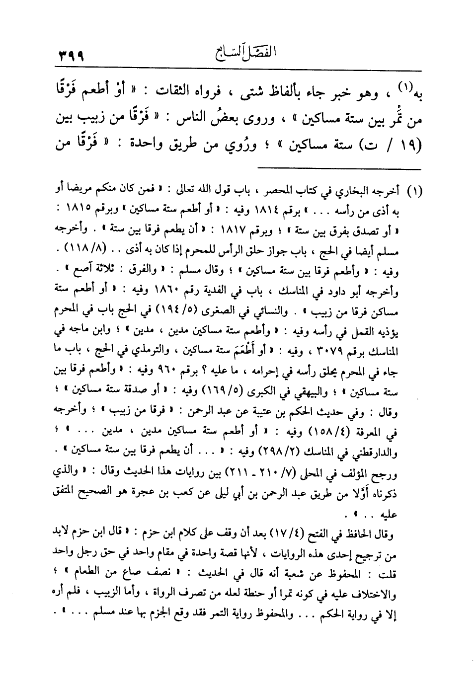 ورجح المؤلف في المحلى (٧/ ٢١٠ - ٢١١) بين روايات هذا الحديث وقال: "والذي ذكرناه أَوَّلا من طريق عبد الرحمن بن أبي ليلى عن كعب بن عجرة هو الصحيح المتفق عليه .. ".