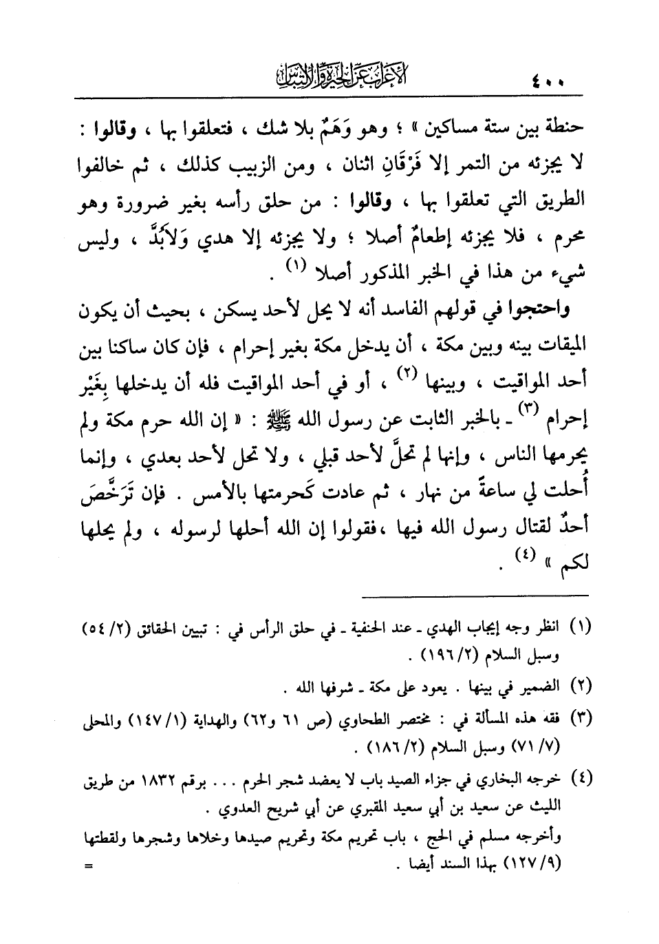 واحتجوا في قولهم الفاسد أنه لا يحل لأحد يسكن، بحيث أن يكون الميقات بينه وبين مكة، أن يدخل مكة بغير إحرام، فإن كان ساكنا بين أحد المواقيت، وبينها (¬٢)، أو في أحد المواقيت فله أن يدخلها بِغَيْر إحرام (¬٣) - بالخبر الثابت عن رسول الله -صلى الله عليه وسلم-: "إن الله حرم مكة ولم يحرمها الناس، وإنها لم تحلَّ لأحد قبلي، ولا تحل لأحد بعدي، وإنما أُحلت لي ساعةً من نهار، ثم عادت كَحرمتها بالأمس. فإن تَرَخَّصَ أحدٌ لقتال رسول الله فيها، فقولوا إن الله أحلها لرسوله، ولم يحلها لكم" (¬٤).