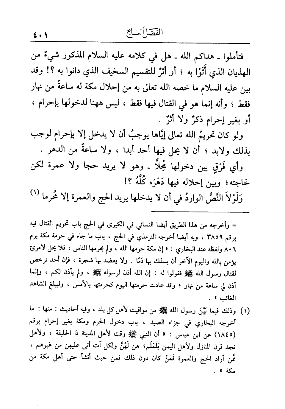 فتأملوا -هداكم الله- هل في كلامه عليه السلام المذكور شيءٌ من الهذيان الذي أَتَوْا به؛ أو أثرٌ للتقسيم السخيف الذي دانوا به؟ ! وقد بين عليه السلام ما خصه الله تعالى به من إحلال مكة له ساعةً من نهار فقط؛ وأنه إنما هو في القتال فيها فقط، ليس ههنا لدخولها بإحرام، أو بغير إحرام ذكرٌ ولا أثرٌ.