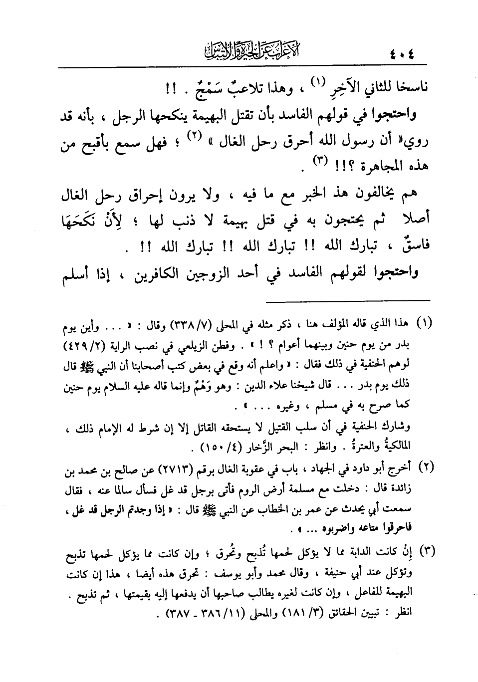 واحتجوا في قولهم الفاسد بأن تقتل البهيمة ينكحها الرجل، بأنه قد روي "أن رسول الله أحرق رحل الغال" (¬٢)؛ فهل سمع بأقبح من هذه المجاهرة؟ ! ! (¬٣).