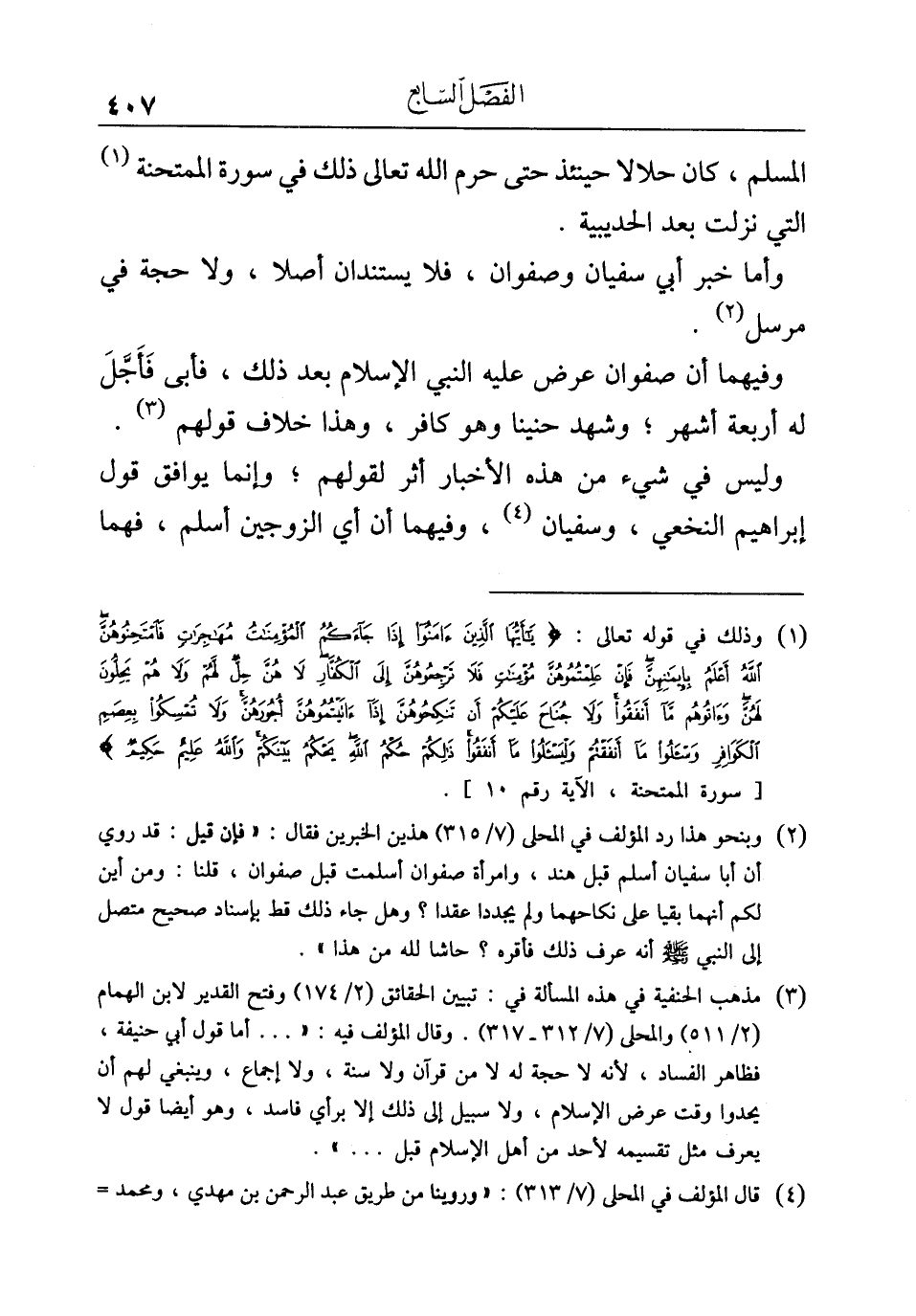 (¬٢) وبنحو هذا رد المؤلف في المحلى (٧/ ٣١٥) هذين الخبرين فقال: "فإن قيل: قد روي أن أبا سفيان أسلم قبل هند، وامرأة صفوان أسلمت قبل صفوان، قلنا: ومن أين لكم أنهما بقيا على نكاحهما ولم يجددا عقدا؟ وهل جاء ذلك قط بإسناد صحيح متصل إلى النبي -صلى الله عليه وسلم- أنه عرف ذلك فأقره؟ حاشا لله من هذا".