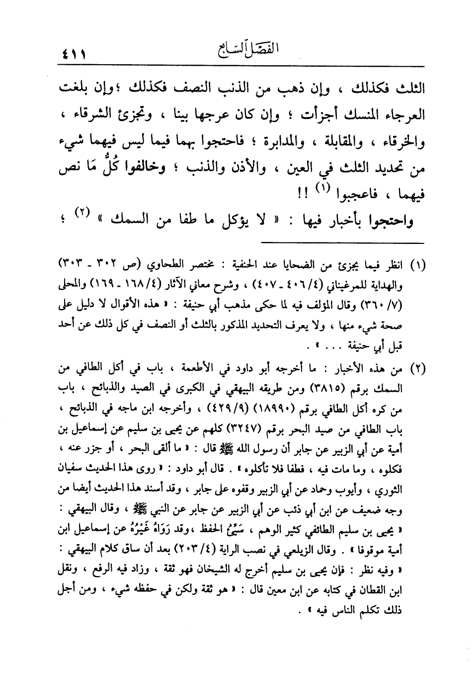 (¬٢) من هذه الأخبار: ما أخرجه أبو داود في الأطعمة، باب في أكل الطافي من السمك برقم (٣٨١٥) ومن طريقه البيهقي في الكبرى في الصيد والذبائح، باب من كره أكل الطافي برقم (١٨٩٩٠) (٩/ ٤٢٩)، وأخرجه ابن ماجه في الذبائح، باب الطافي من صيد البحر برقم (٣٢٤٧) كلهم عن يحيى بن سليم عن إسماعيل بن أمية عن أبي الزبير عن جابر أن رسول الله -صلى الله عليه وسلم- قال: "ما ألقى البحر، أو جزر عنه، فكلوه، وما مات فيه، فطفا فلا تأكلوه"، قال أبو داود: "روى هذا الحديث سفيان الثوري، وأيوب وحماد عن أبي الزبير وقفوه على جابر، وقد أسند هذا الحديث أيضا من وجه ضعيف عن ابن أبي ذئب عن أبي الزبير عن جابر عن النبي -صلى الله عليه وسلم-، وقال البيهقي: "يحيى بن سليم الطائفي كثير الوهم، سَيِّئُ الحفظ، وقد رَوَاهُ غَيْرُهُ عن إسماعيل ابن أمية موقوفا". وقال الزيلعي في نصب الراية (٤/ ٢٠٣) بعد أن ساق كلام البيهقي: "وفيه نظر: فإن يحيى بن سليم أخرج له الشيخان فهو ثقة، وزاد فيه الرفع، ونقل ابن القطان في كتابه عن ابن معين قال: "هو ثقة ولكن في حفظه شيء، ومن أجل ذلك تكلم الناس فيه".
