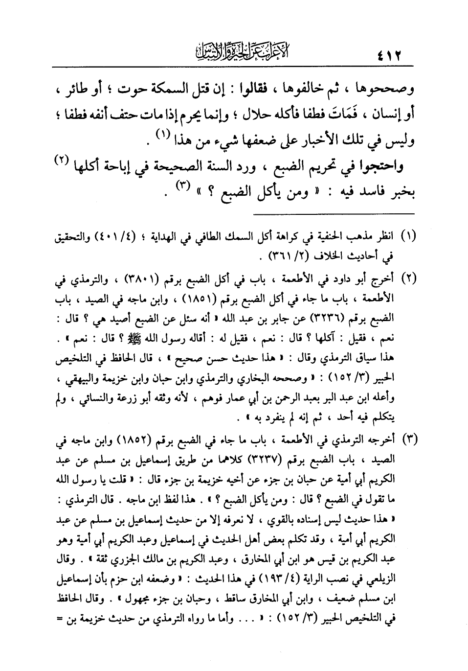 (¬٢) أخرج أبو داود في الأطعمة، باب في أكل الضبع برقم (٣٨٠١)، والترمذي في الأطعمة، باب ما جاء في أكل الضبع برقم (١٨٥١)، وابن ماجه في الصيد، باب الضبع برقم (٣٢٣٦) عن جابر بن عبد الله "أنه سئل عن الضبع أصيد هي؟ قال: نعم، فقيل: آكلها؟ قال: نعم، فقيل له: أقاله رسول الله -صلى الله عليه وسلم-؟ قال: نعم". هذا سياق الترمذي وقال: "هذا حديث حسن صحيح"، قال الحافظ في التلخيص الحبير (٣/ ١٥٢): "وصححه البخاري والترمذي وابن حبان وابن خزيمة والبيهقي، وأعله ابن عبد البر بعبد الرحمن بن أبي عمار فوهم، لأنه وثقه أبو زرعة والنسائي، ولم يتكلم فيه أحد، ثم إنه لم ينفرد به".