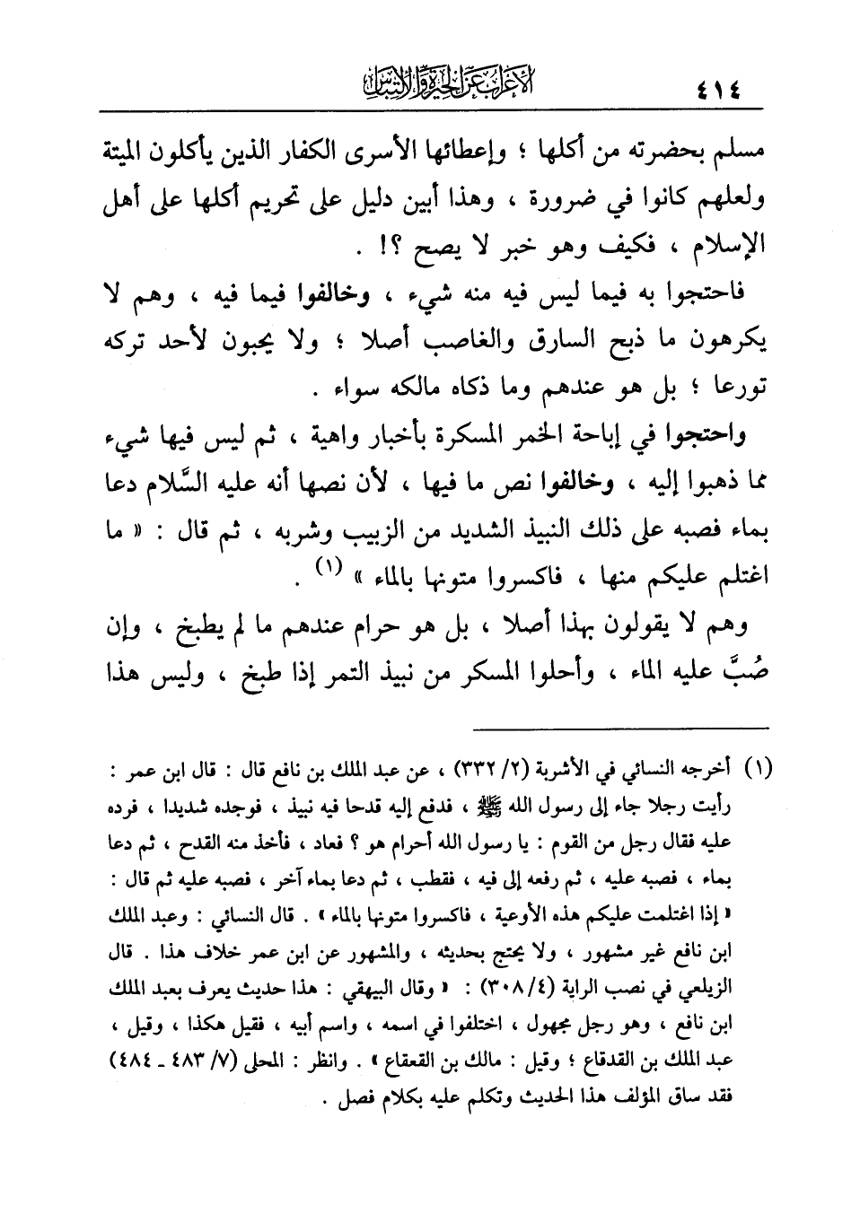 (¬١) أخرجه النسائي في الأشربة (٢/ ٣٣٢)، عن عبد الملك بن نافع قال: قال ابن عمر: رأيت رجلا جاء الى رسول الله -صلى الله عليه وسلم-، فدفع اليه قدحا فيه نبيذ، فوجده شديدا، فرده عليه فقال رجل من القوم: يا رسول الله أحرام هو؟ فعاد، فأخذ منه القدح، ثم دعا بماء، فصبه عليه، ثم رفعه إلى فيه، فقطب، ثم دعا بماء آخر، فصبه عليه ثم قال: "إذا اغتلمت عليكم هذه الأوعية، فاكسروا متونها بالماء". قال النسائي: وعبد الملك ابن نافع غير مشهور، ولا يحتج بحديثه، والمشهور عن ابن عمر خلاف هذا. قال الزيلعي في نصب الراية (٤/ ٣٠٨): "وقال البيهقي: هذا حديث يعرف بعبد الملك ابن نافع، وهو رجل مجهول، اختلفوا في اسمه، واسم أبيه، فقيل هكذا، وقيل، عبد الملك بن القدقاع؛ وقيل: مالك بن القعقاع". وانظر: المحلى (٧/ ٤٨٣ - ٤٨٤) فقد ساق المؤلف هذا الحديث وتكلم عليه بكلام فصل.