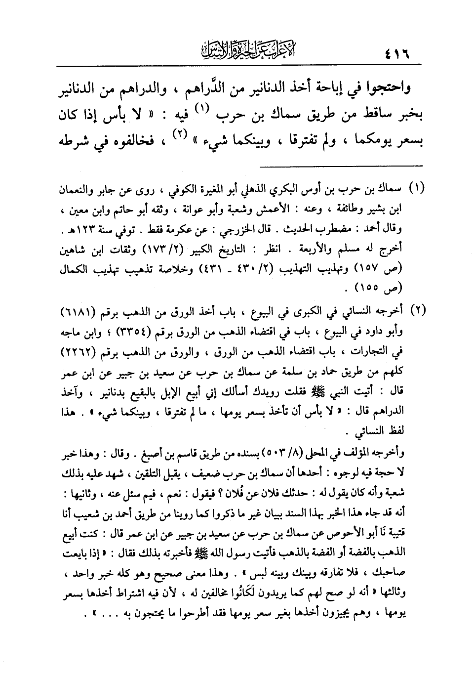 (¬٢) أخرجه النسائي في الكبرى في البيوع، باب أخذ الورق من الذهب برقم (٦١٨١) وأبو داود في البيوع، باب في اقتضاء الذهب من الورق برقم (٣٣٥٤)؛ وابن ماجه في التجارات، باب اقتضاء الذهب من الورق، والورق من الذهب برقم (٢٢٦٢) كلهم من طريق حماد بن سلمة عن سماك بن حرب عن سعيد بن جبير عن ابن عمر قال: أتيت النبي -صلى الله عليه وسلم- فقلت رويدك أسألك إني أبيع الإبل بالبقيع بدنانير، وآخذ الدراهم قال: "لا بأس أن تأخذ بسعر يومها، ما لم تفترقا، وبينكما شيء". هذا لفظ النسائي.