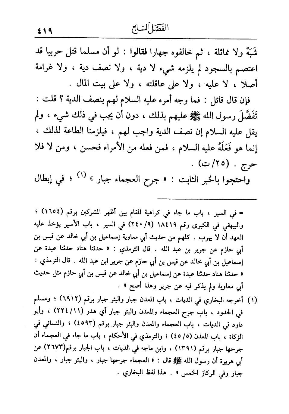 (¬١) أخرجه البخاري في الديات، باب المعدن جبار والبئر جبار برقم (٦٩١٢)؛ ومسلم في الحدود، باب جرح العجماء والمعدن والبئر جبار أي هدر (١١/ ٢٢٤)، وأبو داود في الديات، باب العجماء والمعدن والبئر جبار برقم (٤٥٩٣)؛ والنسائي في الزكاة، باب المعدن (٥/ ٤٥)؛ والترمذي في الأحكام، باب ما جاء في العجماء أن جرحها جبار برقم (١٣٩١)، وابن ماجه في الديات، باب الجبار برقم (٢٦٧٣) عن أبي هريرة أن رسول الله -صلى الله عليه وسلم- قال: "العجماء جرحها جبار، والبئر جبار، والمعدن جبار وفي الركاز الخمس". هذا لفظ البخاري.