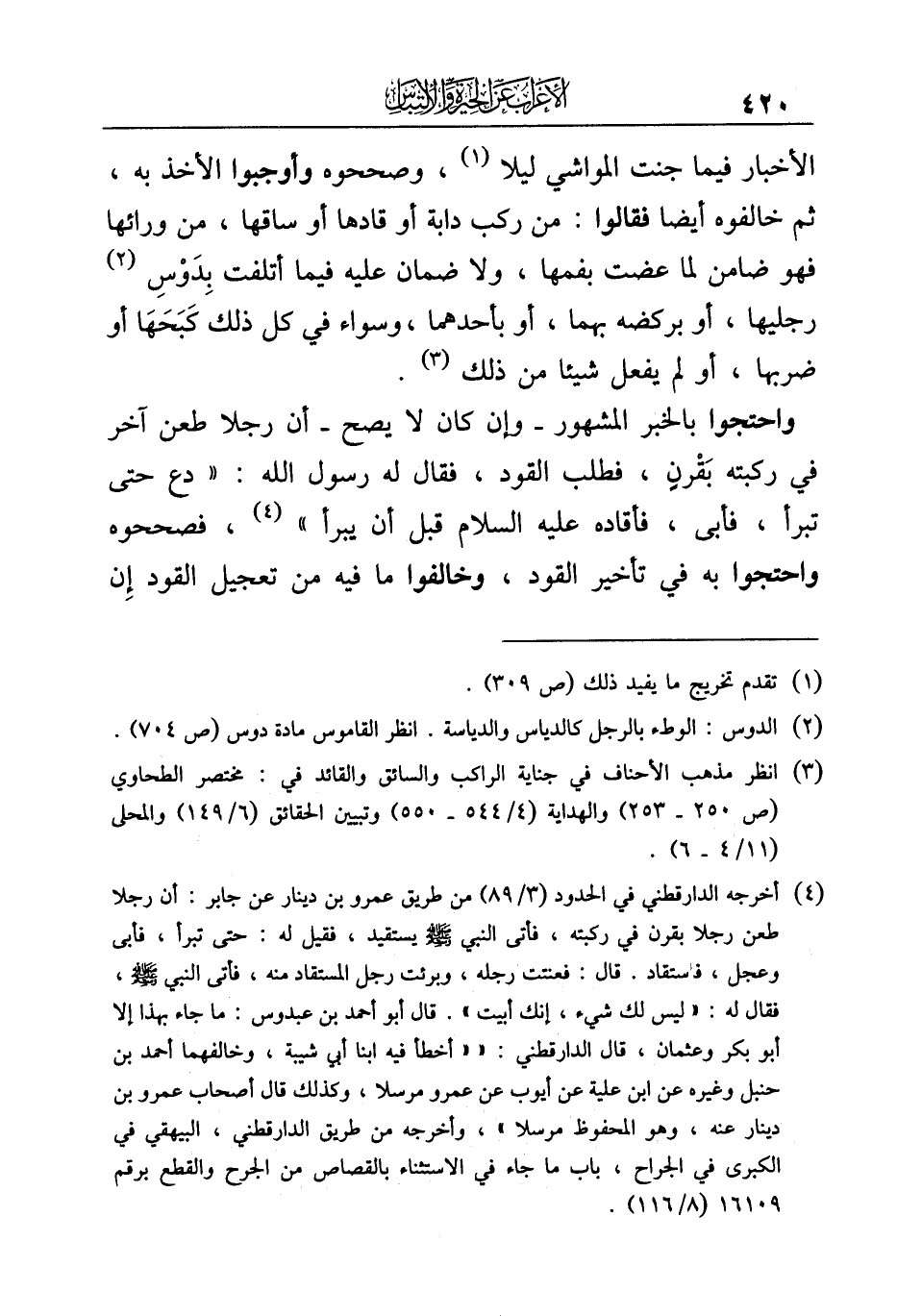 (¬٣) انظر مذهب الأحناف في جناية الراكب والسائق والقائد في: مختصر الطحاوي (ص ٢٥٠ - ٢٥٣) والهداية (٤/ ٥٤٤ - ٥٥٠) وتبيين الحقائق (٦/ ١٤٩) والمحلى (١١/ ٤ - ٦).