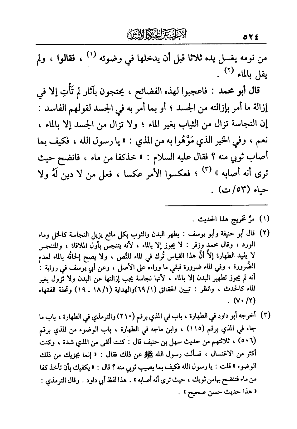 (¬٣) أخرجه أبو داود في الطهارة، باب في المذي برقم (٢١٠) والترمذي في الطهارة، باب ما جاء في المذي برقم (١١٥)، وابن ماجه في الطهارة، باب الوضوء من المذي برقم (٥٠٦)، ثلاثتهم من حديث سهل بن حنيف قال: كنت ألقى من المذي شدة، وكنت أكثر من الاغتسال، فسألت رسول الله - صلى الله عليه وسلم - عن ذلك فقال: "إنما يجزيك من ذلك الوضوء" قلت: يا رسول الله فكيف بما يصيب ثوبي منه؟ قال: "يكفيك بأن تأخذ كفا من ماء فتنضح بها من ثوبك، حيث ترى أنه أصابه". هذا لفظ أبي داود. وقال الترمذي: "هذا حديث حسن صحيح".