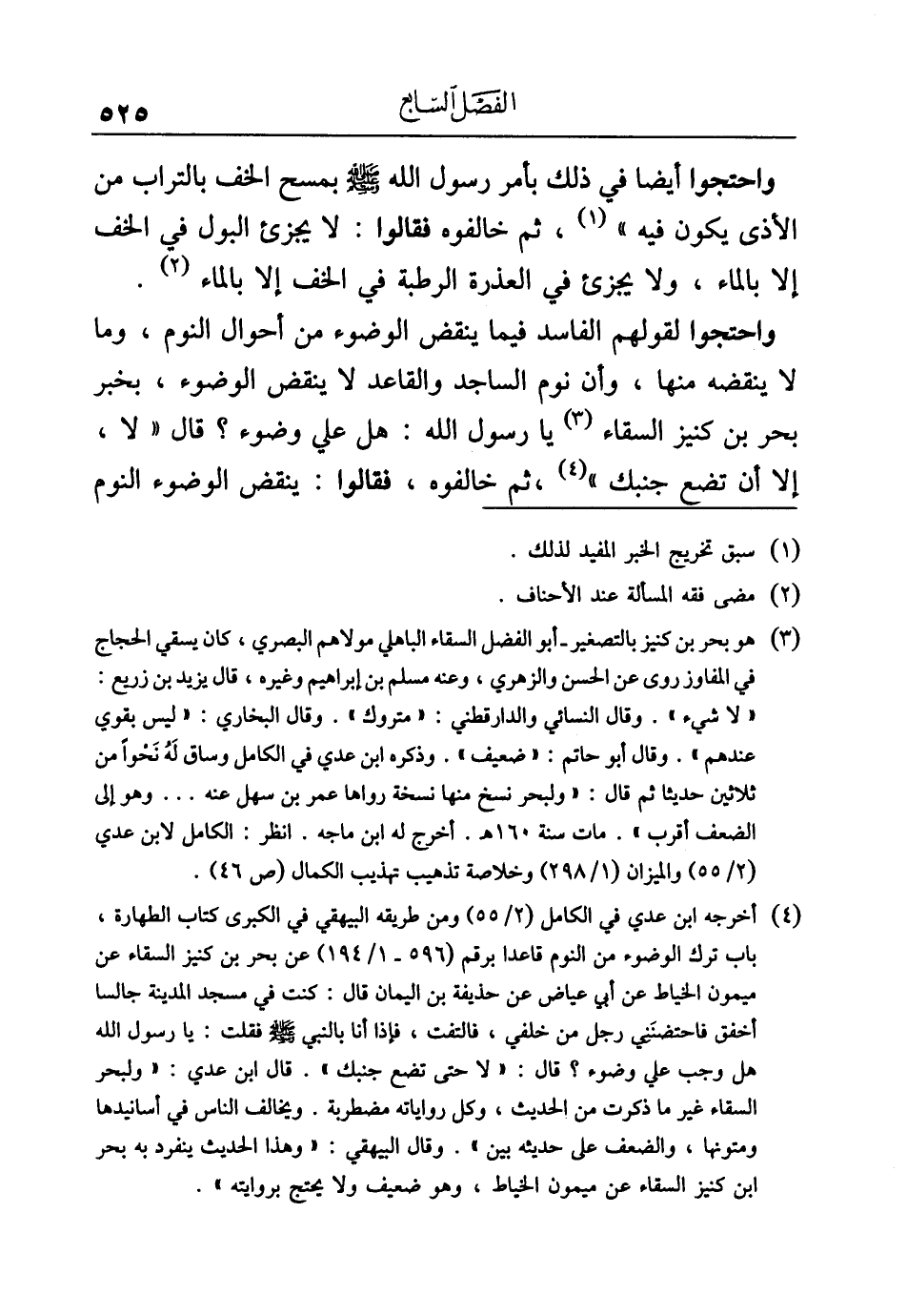 (¬٤) أخرجه ابن عدي في الكامل (٢/ ٥٥) ومن طريقه البيهقي في الكبرى كتاب الطهارة، باب ترك الوضوء من النوم قاعدا برقم (٥٩٦ - ١/ ١٩٤) عن بحر بن كنيز السقاء عن ميمون الخياط عن أبي عياض عن حذيفة بن اليمان قال: كنت في مسجد المدينة جالسا أخفق فاحتضنَنِي رجل من خلفي، فالتفت، فإذا أنا بالنبي - صلى الله عليه وسلم - فقلت: يا رسول الله هل وجب علي وضوء؟ قال: "لا حتى تضع جنبك". قال ابن عدي: "ولبحر السقاء غير ما ذكرت من الحديث، وكل رواياته مضطربة. ويخالف الناس في أسانيدها ومتونها، والضعف على حديثه بين". وقال البيهقي: "وهذا الحديث ينفرد به بحر بن كنيز السقاء عن ميمون الخياط، وهو ضعيف ولا يحتج بروايته".