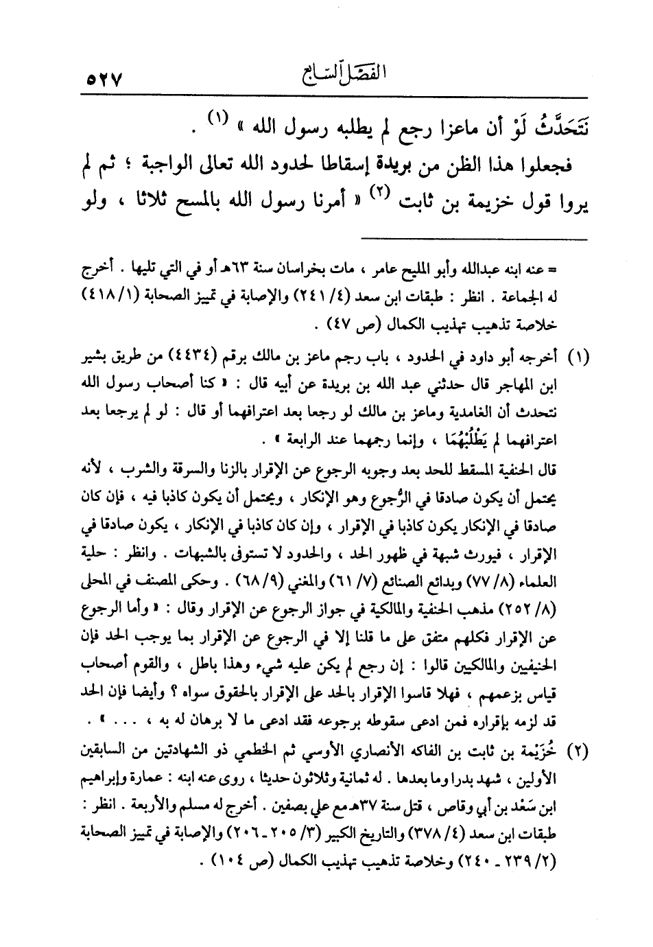 (¬١) أخرجه أبو داود في الحدود، باب رجم ماعز بن مالك برقم (٤٤٣٤) من طريق بشير بن المهاجر قال حدثني عبد الله بن بريدة عن أبيه قال: "كنا أصحاب رسول الله نتحدث أن الغامدية وماعز بن مالك لو رجعا بعد اعترافهما أو قال: لو لم يرجعا بعد اعترافهما لم يَطْلُبْهُمَا، وإنما رجمهما عند الرابعة".