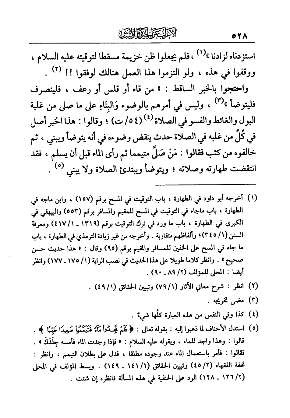(¬٥) استدل الأحناف لما ذهبوا إليه: بقوله تعالى: {فَلَمْ تَجِدُوا مَاءً فَتَيَمَّمُوا صَعِيدًا طَيِّبًا} قالوا: وهذا واجد للماء، ويقوله عليه السلام: "فإذا وجدت الماء فأمسه جِلْدَكَ". فقالوا: فأمر باستعمال الماء عند وجوده مطلقا، فدل على بطلان التيمم، وانظر: تحفة الفقهاء (٢/ ٤٥) وتبيين الحقائق (١/ ١٤١ - ١٤٩). وبسط المؤلف في المحلى (٢/ ١٢٦ - ١٢٨) الرد على الحنفية في هذه المسألة فانظره إن شئت.