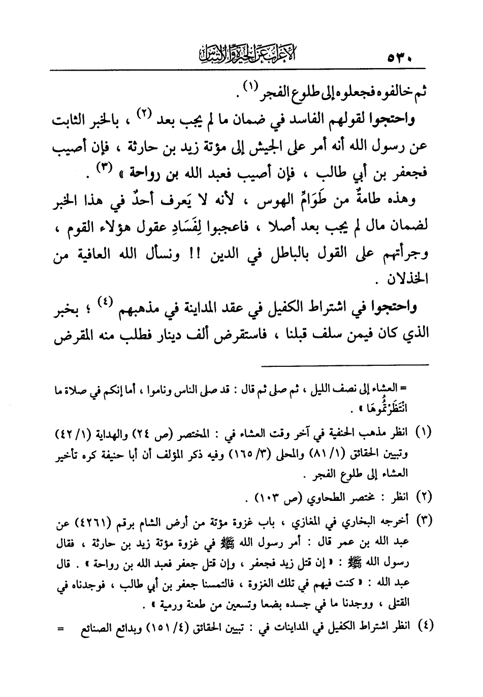 (¬١) انظر مذهب الحنفية في آخر وقت العشاء في: المختصر (ص ٢٤) والهداية (١/ ٤٢) وتبين الحقائق (١/ ٨١) والمحلى (٣/ ١٦٥) وفيه ذكر المؤلف أن أبا حنيفة كره تأخير العشاء إلى طلوع الفجر.