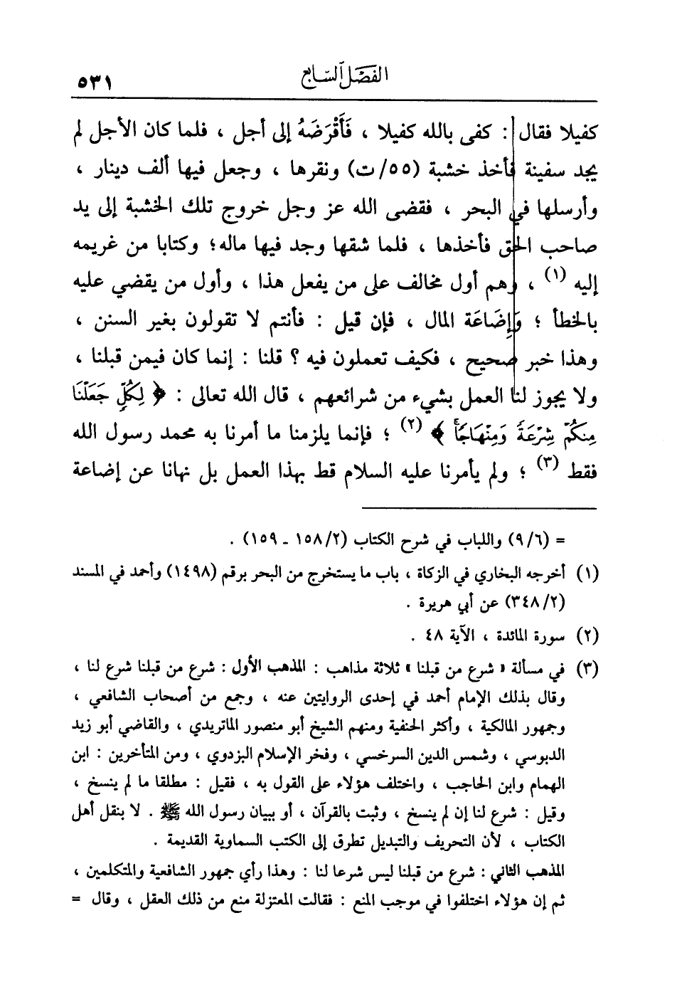 كفيلا فقال: كفى بالله كفيلا، فَأقْرَضَهُ إلى أجل، فلما كان الأجل لم يجد سفينة فأخذ خشبة ونقرها، وجعل فيها ألف دينار، وأرسلها في البحر، فقضى الله عز وجل خروج تلك الخشبة إلى يد صاحب الحق فأخذها، فلما شقها وجد فيها ماله؛ وكتابا من غريمه إليه (¬١)، وهم أول مخالف على من يفعل هذا، وأول من يقضي عليه بالخطأ؛ وَإِضَاعَة المال، فإن قيل: فأنتم لا تقولون بغير السنن، وهذا خبر صحيح، فكيف تعملون فيه؟ قلنا: إنما كان فيمن قبلنا، ولا يجوز لنا العمل بشيء من شرائعهم، قال الله تعالى: {لِكُلٍّ جَعَلْنَا مِنْكُمْ شِرْعَةً وَمِنْهَاجًا} (¬٢)؛ فإنما يلزمنا ما أمرنا به محمد رسول الله فقط (¬٣)؛ ولم يأمرنا عليه السلام قط بهذا العمل بل نهانا عن إضاعة