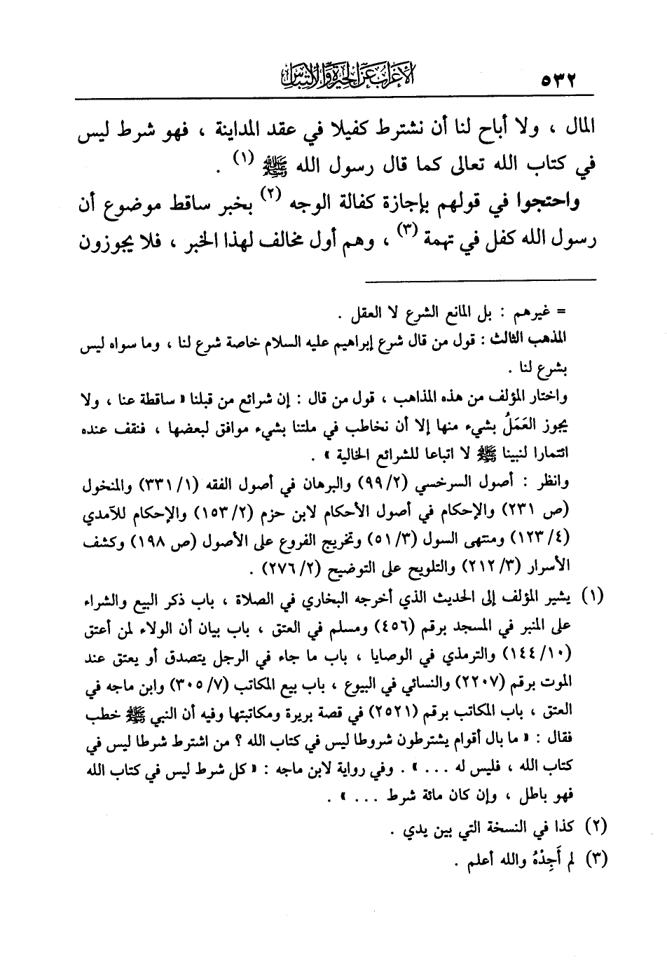 (¬١) يشير المؤلف إلى الحديث الذي أخرجه البخاري في الصلاة، باب ذكر البيع والشراء على المنبر في المسجد برقم (٤٥٦) ومسلم في العتق، باب بيان أن الولاء لمن أعتق (١٠/ ١٤٤) والترمذي في الوصايا، باب ما جاء في الرجل يتصدق أو يعتق عند الموت برقم (٢٢٠٧) والنسائي في البيوع، باب بيع المكاتب (٧/ ٣٠٥) وابن ماجة في العتق، باب المكاتب برقم (٢٥٢١) في قصة بريرة ومكاتبتها وفيه أن النبي صلى الله عليه وسلم خطب فقال: "ما بال أقوام يشترطون شروطا ليس في كتاب الله؟ من اشترط شرطا ليس في كتاب الله، فليس له ... ". وفي رواية لابن ماجة: "كل شرط ليس في كتاب الله فهو باطل، وإن كان مائة شرط ... ".