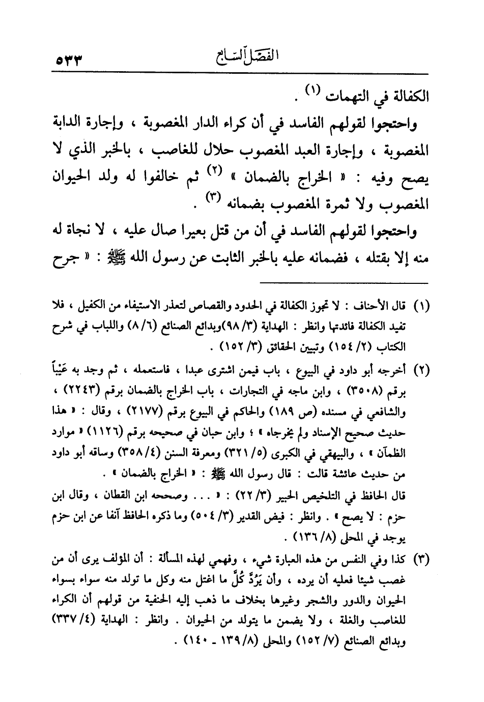 (¬٣) كذا وفي النفس من هذه العبارة شيء، وفهمي لهذه المسألة: أن المؤلف يرى أن من غصب شيئا فعليه أن يرده، وأن يَرُدَّ كُلَّ ما اغتل منه وكل ما تولد منه سواء بسواء الحيوان والدور والشجر وغيرها بخلاف ما ذهب إليه الحنفية من قولهم أن الكراء للغاصب والغلة، ولا يضمن ما يتولد من الحيوان. وانظر: الهداية (٤/ ٣٣٧) وبدائع الصنائع (٧/ ١٥٢) والمحلى (٨/ ١٣٩ - ١٤٠).