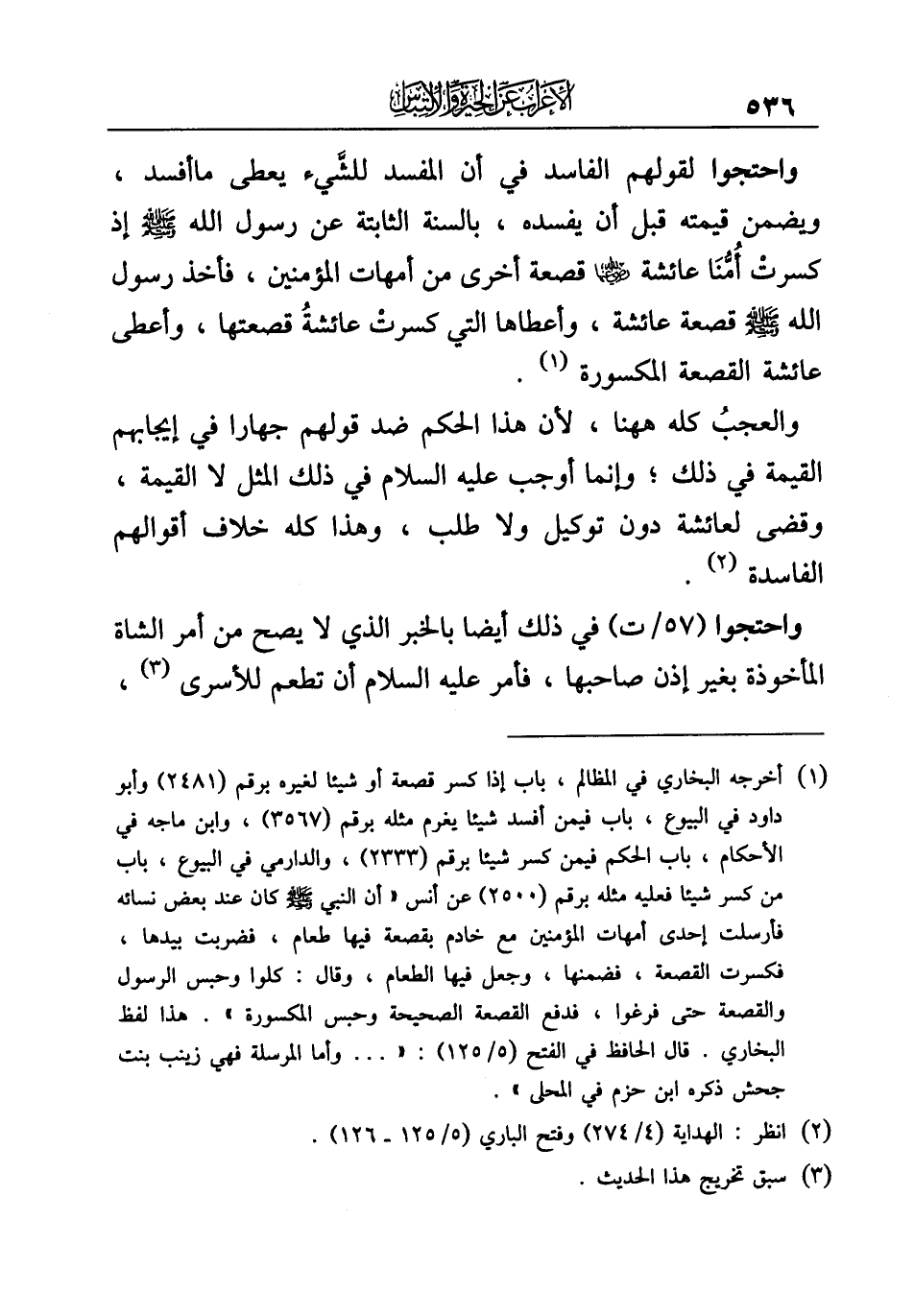 واحتجوا لقولهم الفاسد في أن المفسد للشَّيء يعطى ما أفسد، ويضمن قيمته قبل أن يفسده، بالسنة الثابتة عن رسول الله - صلى الله عليه وسلم - إذ كسرتْ أُمُّنَا عائشة - رضي الله عنها - قصعة أخرى من أمهات المؤمنين، فأخذ رسول الله - صلى الله عليه وسلم - قصعة عائشة، وأعطاها التي كسرتْ عائشة قصعتها، وأعطى عائشة القصعة المكسورة (¬١).