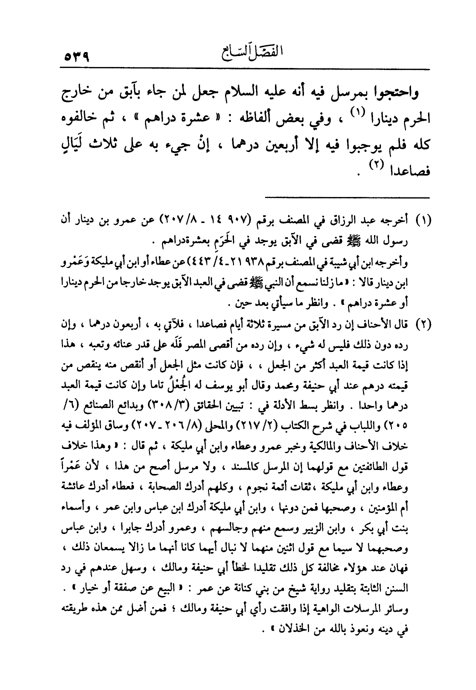 (¬٢) قال الأحناف إن رد الآبق من مسيرة ثلاثة أيام فصاعدا، فلآتي به، أربعون درهما، وإن رده دون ذلك فليس له شيء، وإن رده من أقصى المصر فَلَه على قدر عنائه وتعبه، هذا إذا كانت قيمة العبد أكثر من الجعل، فإن كانت مثل الجعل أو أنقص منه ينقص من قيمته درهم عند أبي حنيفة ومحمد وقال أبو يوسف له الجُعْلُ تاما وإن كانت قيمة العبد درهما واحدا. وانظر بسط الأدلة في: تبيين الحقائق (٣/ ٣٠٨) وبدائع الصنائع (٦/ ٢٠٥) واللباب في شرح الكتاب (٢/ ٢١٧) والمحلى (٨/ ٢٠٦ - ٢٠٧) وساق المؤلف فيه خلاف الأحناف والمالكية وخبر عمرو وعطاء وابن أبي مليكة، ثم قال: "وهذا خلاف قول الطائفتين مع قولهما إن المرسل كالمسند، ولا مرسل أصح من هذا، لأن عَمْرًا وعطاء وابن أبي مليكة، ثقات أئمة نجوم، وكلهم أدرك الصحابة، فعطاء أدرك عائشة أم المؤمنين، وصحبها فمن دونها، وابن أبي مليكة أدرك ابن عباس وابن عمر، وأسماء بنت أبي بكر، وابن الزبير وسمع فهم وجالسهم، وعمرو أدرك جابرا، وابن عباس وصحبهما لا سيما مع قول اثنين منهما لا نبال أيهما كانا أنهما ما زالا يسمعان ذلك، فهان عند هؤلاء مخالفة كل ذلك تقليدا لخطأ أبي حنيفة ومالك، وسهل عندهم في رد السنن الثابتة بتقليد رواية شيخ من بني كنانة عن عمر: "البيع عن صفقة أو خيار". وسائر المرسلات الواهية إذا وافقت رأي أبي حنيفة ومالك؛ فمن أضل ممن هذه طريقته في دينه ونعوذ بالله من الخذلان".