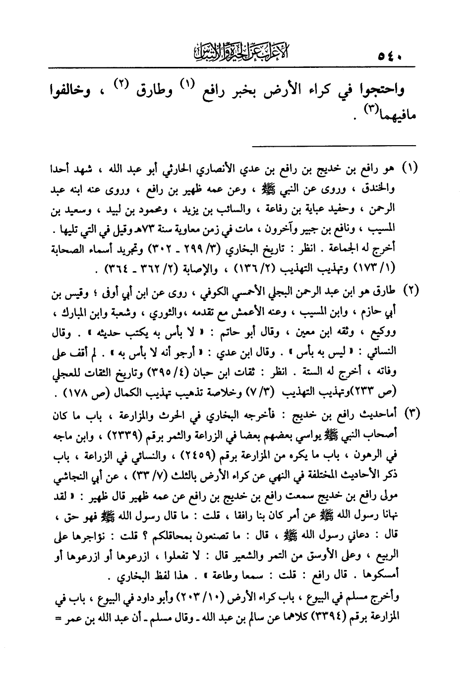 (¬٣) أما حديث رافع بن خديج: فأخرجه البخاري في الحرث والمزارعة، باب ما كان أصحاب النبي - صلى الله عليه وسلم - يواسي بعضهم بعضا في الزراعة والثمر برقم (٢٣٣٩)، وابن ماجه في الرهون، باب ما يكره من المزارعة برقم (٢٤٥٩)، والنسائي في الزراعة، باب ذكر الأحاديث المختلفة في النهي عن كراء الأرض بالثلث (٧/ ٣٣)، عن أبي النجاشي مولى رافع بن خديج سمعت رافع بن خديج بن رافع عن عمه ظهير قال ظهير: "لقد نهانا رسول الله - صلى الله عليه وسلم - عن أمر كان بنا رافقا، قلت: ما قال رسول الله - صلى الله عليه وسلم - فهو حق، قال: دعاني رسول الله - صلى الله عليه وسلم -، قال: ما تصنعون بمحاقلكم؟ قلت: نؤاجرها على الربيع، وعلى الأوسق من التمر والشعير قال: لا تفعلوا، ازرعوها أو ازرعوها أو أمسكوها. قال رافع: قلت: سمعا وطاعة". هذا لفظ البخاري.