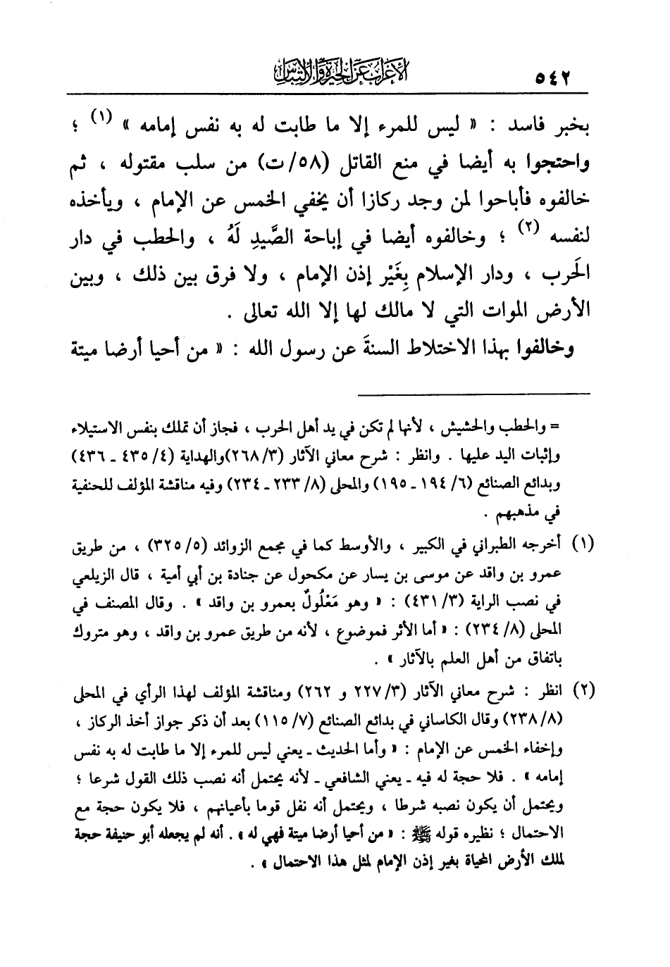 (¬٢) انظر: شرح معاني الآثار (٣/ ٢٢٧ و ٢٦٢) ومناقشة المؤلف لهذا الرأي في المحلى (٨/ ٢٣٨) وقال الكاساني في بدائع الصنائع (٧/ ١١٥) بعد أن ذكر جواز أخذ الركاز، وإخفاء الخمس عن الإمام: "وأما الحديث - يعني ليس للمرء إلا ما طابت له به نفس إمامه". فلا حجة له فيه - يعني الشافعي - لأنه يحتمل أنه نصب ذلك القول شرعا؛ ويحتمل أن يكون نصبه شرطا، ويحتمل أنه نفل قوما بأعيانهم، فلا يكون حجة مع الاحتمال؛ نظيره قوله - صلى الله عليه وسلم -: "من أحيا أرضا ميتة فهي له". أنه لم يجعله أبو حنيفة حجة لملك الأرض المحياة بغير إذن الإمام لمثل هذا الاحتمال".