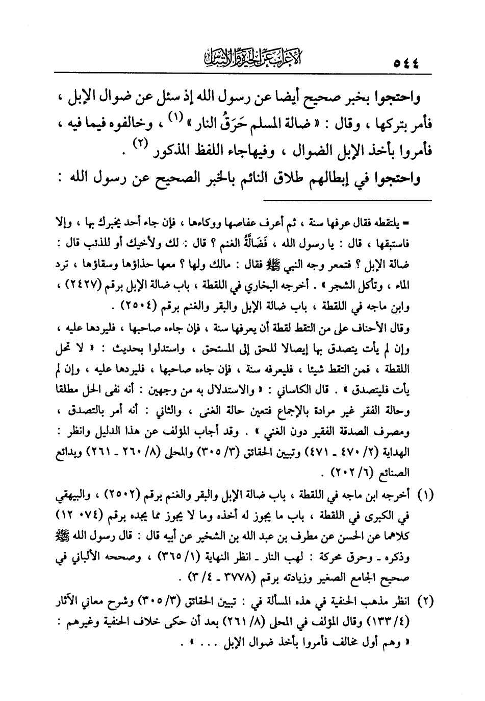 (¬٢) انظر مذهب الحنفية في هذه المسألة في: تبيين الحقائق (٣/ ٣٠٥) وشرح معاني الآثار (٤/ ١٣٣) وقال المؤلف في المحلى (٨/ ٢٦١) بعد أن حكى خلاف الحنفية وغيرهم: "وهم أول مخالف فأمروا بأخذ ضوال الإبل ... ".