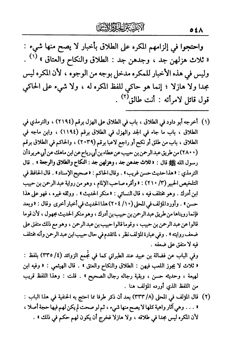 (¬١) أخرجه أبو داود في الطلاق، باب في الطلاق على الهزل برقم (٢١٩٤)، والترمذي في الطلاق، باب ما جاء في الجد والهزل في الطلاق برقم (١١٩٤)، وابن ماجه في الطلاق، باب من طلق أو نكح أو راجع لاعبا بوقم (٢٠٣٩)، والحاكم في الطلاق برقم (٢٨٠٠) من طريق عبد الرحمن بن حبيب عن عطاء بن أبي رباح عن ابن ماهك عن أبي هريرة أن رسول الله - صلى الله عليه وسلم - قال: "ثلاث جدهن جد، وهزلهن جد: النكاح والطلاق والرجعة". قال الترمذي: "هذا حديث حسن غريب". وقال الحاكم: "صحيح الإسناد". قال الحافظ في التلخيص الحبير (٣/ ٢١٠): "وأقره صاحب الإلمام، وهو من رواية عبد الرحمن بن حبيب بن أدرك. وهو مختلف فيه، قال النسائي: "منكر الحديث". ووثقه غيره، فهو على هذا حسن". وأورد المؤلف في المحلى (١٠/ ٢٠٤) هذا الحديث في أخبار أخرى وقال: "وبعد فإنما رويناها من طريق عبد الرحمن بن حبيب بن أدرك، وهو منكر الحديث مجهول، لأن قوما قالوا عن عبد الرحمن بن حبيب، وقوما قالوا حبيب بن عبد الرحمن، وهو مع ذلك متفق على ضعف روايته". وفي عبارة المؤلف نظر، لما تقدم في حال حبيب بن عبد الرحمن وأنه مختلف فيه لا متفق على ضعفه.