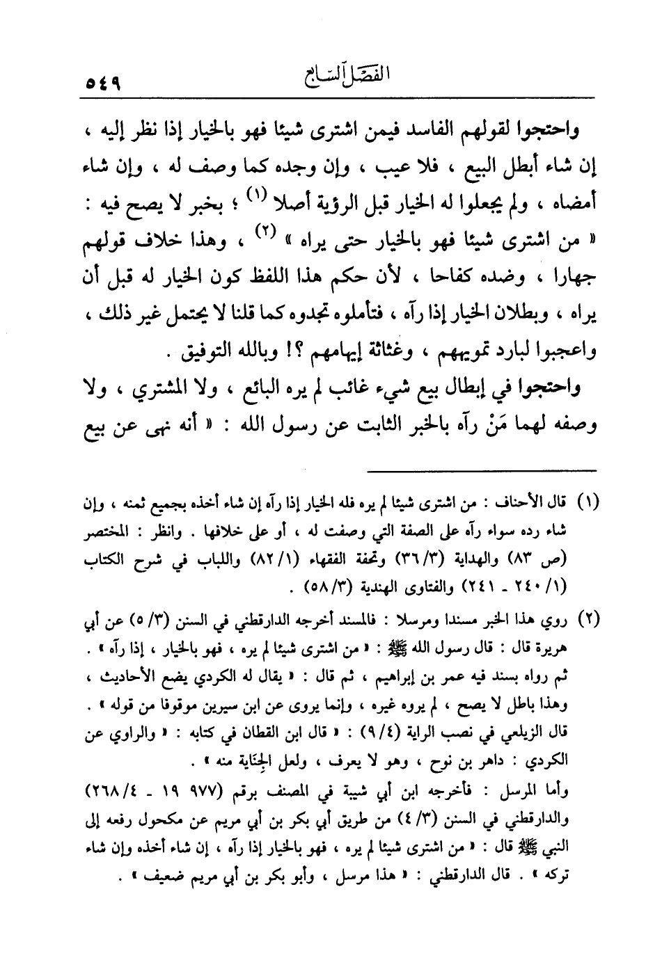 (¬٢) روي هذا الخبر مسندا ومرسلا: فالمسند أخرجه الدارقطني في السنن (٣/ ٥) عن أبي هريرة قال: قال رسول الله - صلى الله عليه وسلم -: "من اشترى شيئا لم يره، فهو بالخيار، إذا رآه". ثم رواه بسند فيه عمر بن إبراهيم، ثم قال: "يقال له الكردي يضع الأحاديث، وهذا باطل لا يصح، لم يروه غيره، وإنما يروى عن ابن سيرين موقوفا من قوله". قال الزيلعي في نصب الراية (٤/ ٩): "قال ابن القطان في كتابه: "والراوي عن الكردي: داهر بن نوح، وهو لا يعرف، ولعل الجِنَاية منه".