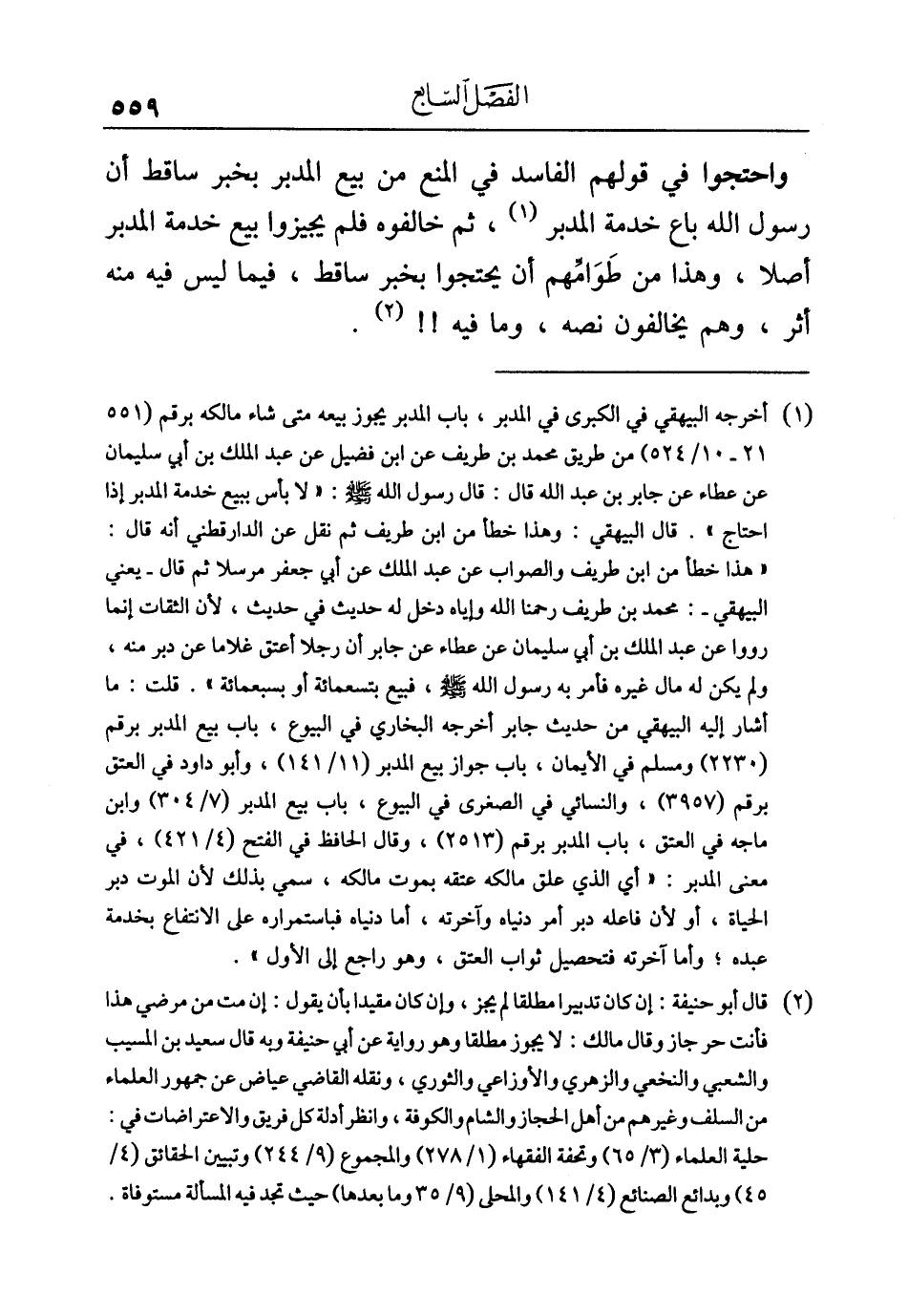(¬٢) قال أبو حنيفة: إن كان تدبيرا مطلقا لم يجز، وإن كان مقيدا بأن يقول: إن مت من مرضي هذا فأنت حر جاز وقال مالك: لا يجوز مطلقا وهو رواية عن أبي حنيفة ويه قال سعيد بن المسيب والشعبي والنخعي والزهري والأوزاعي والثوري، ونقله القاضي عياض عن جهور العلماء من السلف وغيرهم من أهل الحجاز والشام والكوفة، وانظر أدلة كل فريق والاعتراضات في: حلية العلماء (٣/ ٦٥) وتحفة الفقهاء (١/ ٢٧٨) والمجموع (٩/ ٢٤٤) وتبيين الحقائق (٤/ ٤٥) وبدائع الصنائع (٤/ ١٤١) والمحلى (٩/ ٣٥ وما بعدها) حيث تجد فيه المسألة مستوفاة.