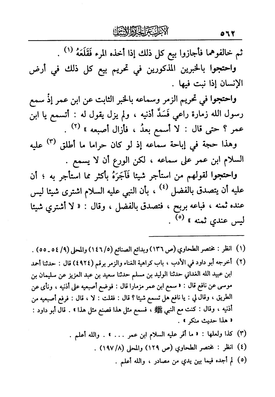 واحتجوا في تحريم الزمر وسماعه بالخبر الثابت عن ابن عمر إذْ سمع رسول الله زمارة راعي فَسَدَّ أذنيه، ولم يزل يقول له: أتسمع يا ابن عمر؟ حتى قال: لا أسمع بعدُ، فأزال أصبعه" (¬٢).
