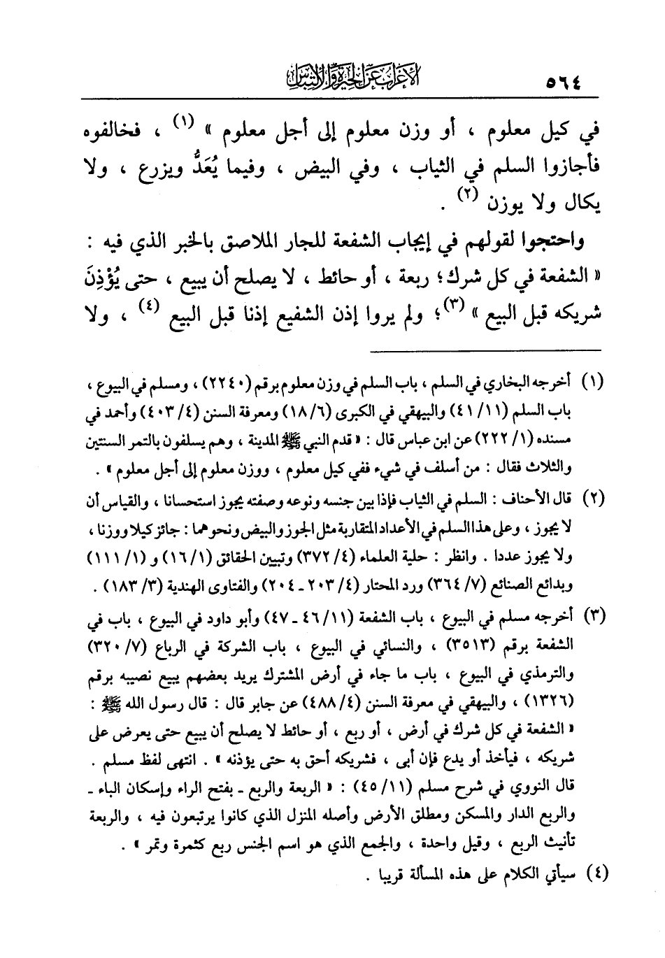 (¬٣) أخرجه مسلم في البيوع، باب الشفعة (١١/ ٤٦ - ٤٧) وأبو داود في البيوع، باب في الشفعة برقم (٣٥١٣)، والنسائي في البيوع، باب الشركة في الرباع (٧/ ٣٢٠) والترمذي في البيوع، باب ما جاء في أرض المشترك يريد بعضهم يبيع نصيبه برقم (١٣٢٦)، والبيهقي في معرفة السنن (٤/ ٤٨٨) عن جابر قال: قال رسول الله - صلى الله عليه وسلم -: "الشفعة في كل شرك في أرض، أو ربع، أو حائط لا يصلح أن يبيع حتى يعرض على شريكه، فياخذ أو يدع فإن أبى، فشريكه أحق به حتى يؤذنه". اننهى لفظ مسلم.