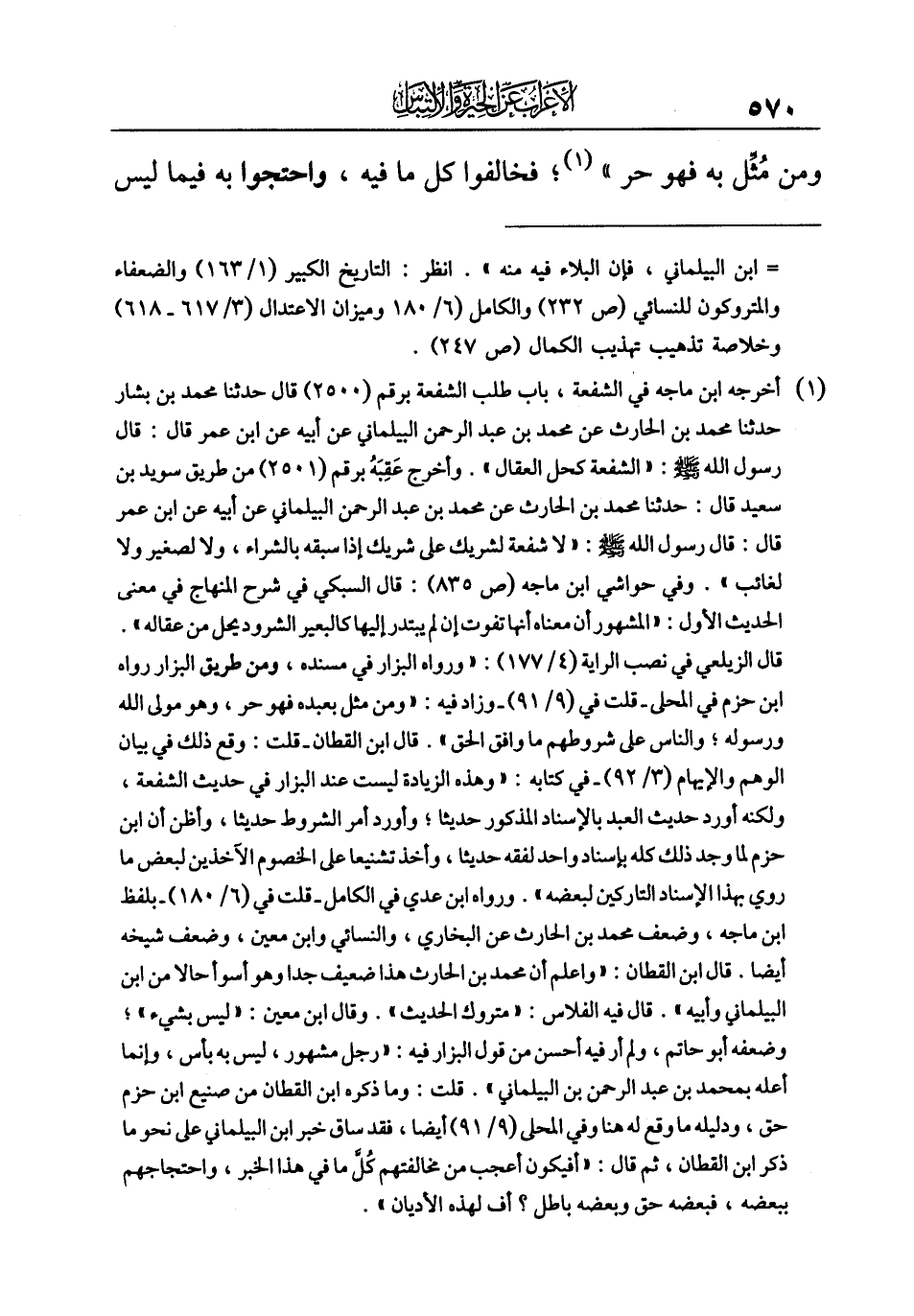 (¬١) أخرجه ابن ماجه في الشفعة، باب طلب الشفعة برقم (٢٥٠٠) قال حدثنا محمد بن بشار حدثنا محمد بن الحارث عن محمد بن عبد الرحمن البيلماني عن أبيه عن ابن عمر قال: قال رسول الله - صلى الله عليه وسلم -: "الشفعة كحل العقال". وأخرج عَقِبَهُ برقم (٢٥٠١) من طريق سويد بن سعيد قال: حدثنا محمد بن الحارث عن محمد بن عبد الرحمن البيلماني عن أبيه عن ابن عمر قال: قال رسول الله - صلى الله عليه وسلم -: "لا شفعة لشريك على شريك إذا سبقه بالشراء، ولا لصغير ولا لغائب". وفي حواشي ابن ماجه (ص ٨٣٥): قال السبكي في شرح المنهاج في معنى الحديث الأول: "المشهور أن معناه أنها تفوت إن لم يبتدر إليها كالبعير الشرود يحل من عقاله".