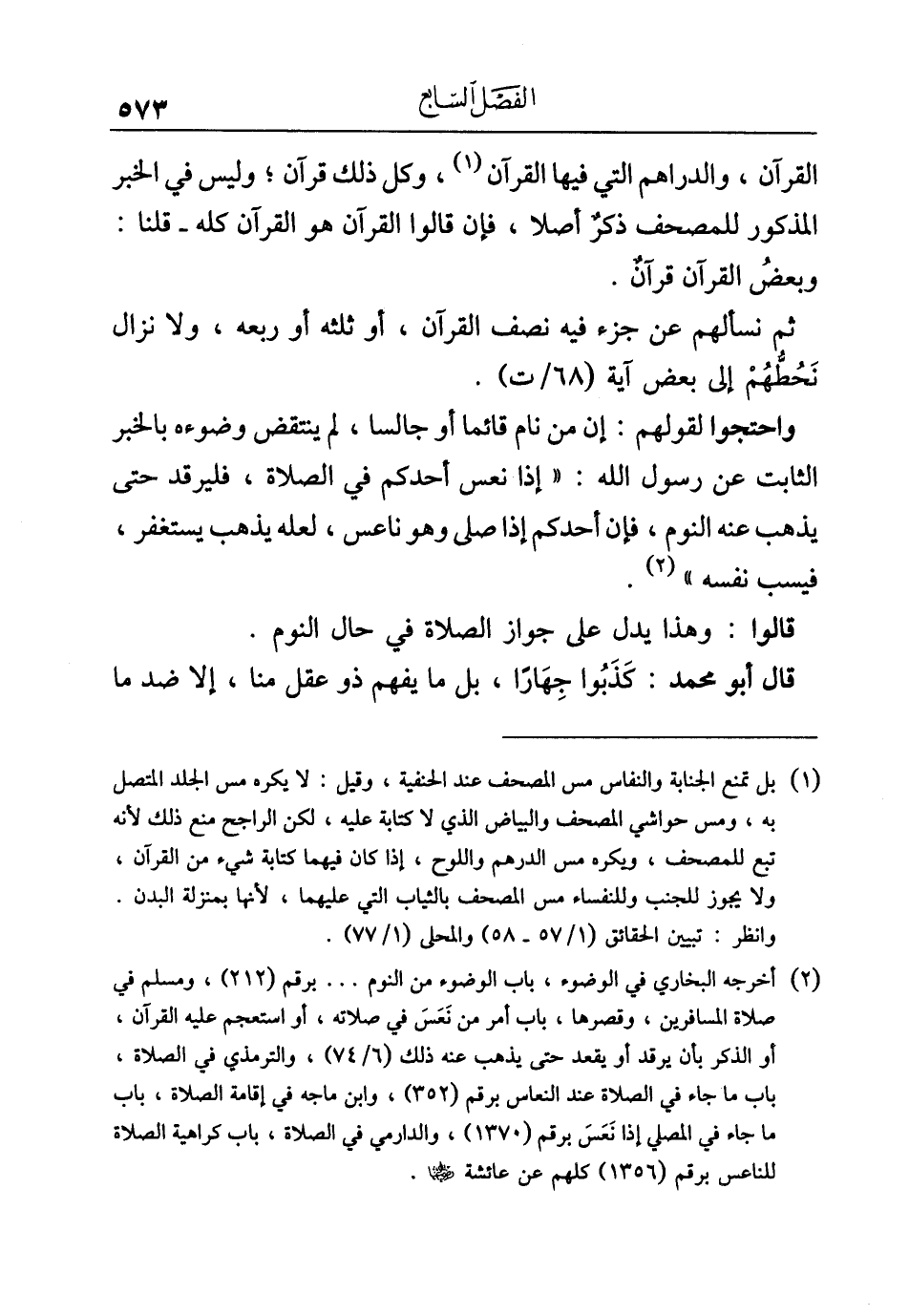 واحتجوا لقولهم: إن من نام قائما أو جالسا، لم ينتقض وضوءه بالخبر الثابت عن رسول الله: "إذا نعس أحدكم في الصلاة، فليرقد حتى يذهب عنه النوم، فإن أحدكم إذا صلى وهو ناعس، لعله يذهب يستغفر، فيسب نفسه" (¬٢).