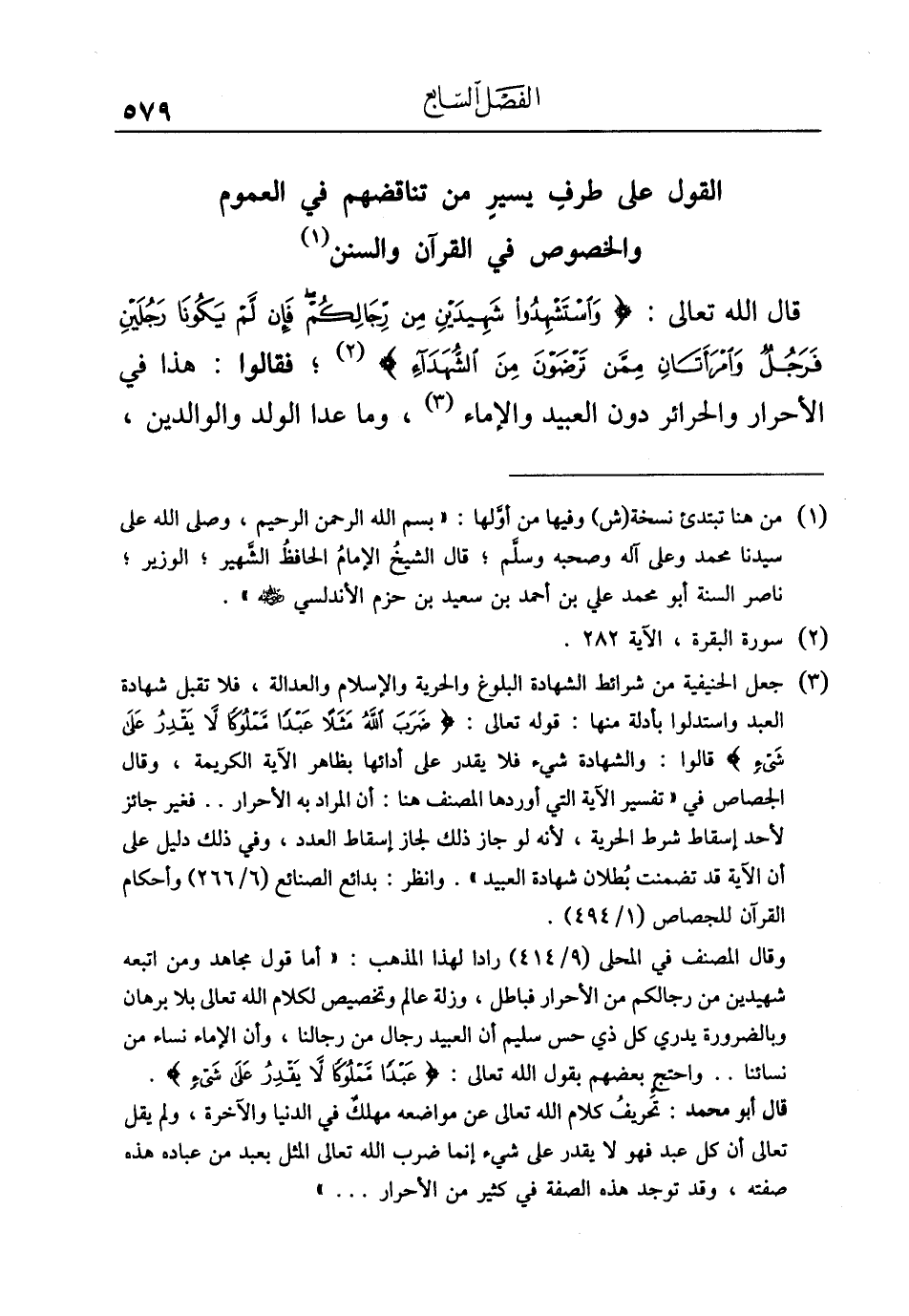 وقال المصنف في المحلى (٩/ ٤١٤) رادا لهذا المذهب: "أما قول مجاهد ومن اتبعه شهيدين من رجالكم من الأحرار فباطل، وزلة عالم وتخصيص لكلام الله تعالى بلا برهان وبالضرورة يدري كل ذي حس سليم أن العبيد رجال من رجالنا، وأن الإماء نساء من نسائنا .. واحتج بعضهم بقول الله تعالى: {عَبْدًا مَمْلُوكًا لَا يَقْدِرُ عَلَى شَيْءٍ}.
