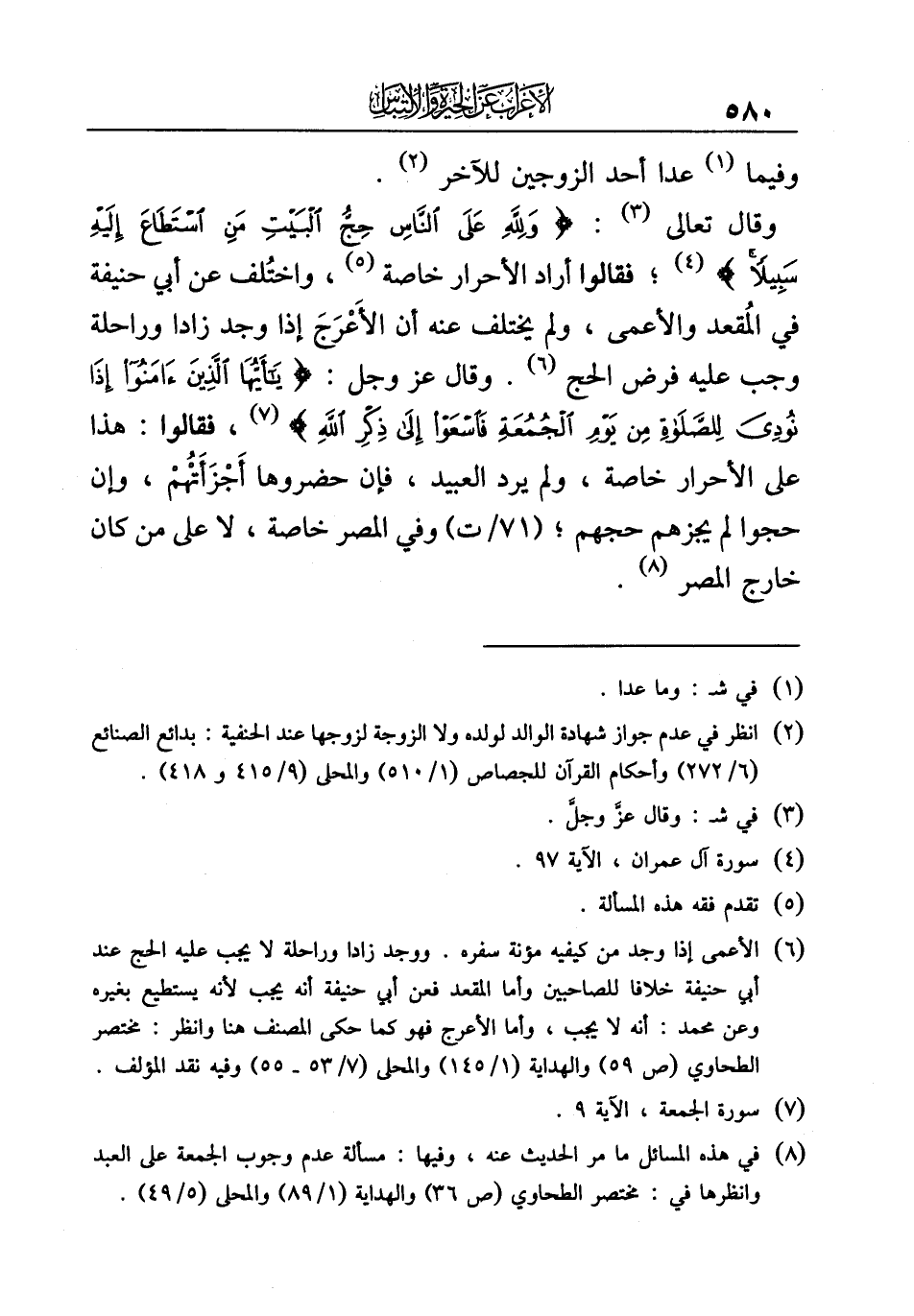 (¬٨) في هذه المسائل ما مر الحديث عنه، وفيها: مسألة عدم وجوب الجمعة على العبد وانظرها في: مختصر الطحاوي (ص ٣٦) والهداية (١/ ٨٩) والمحلى (٥/ ٤٩).