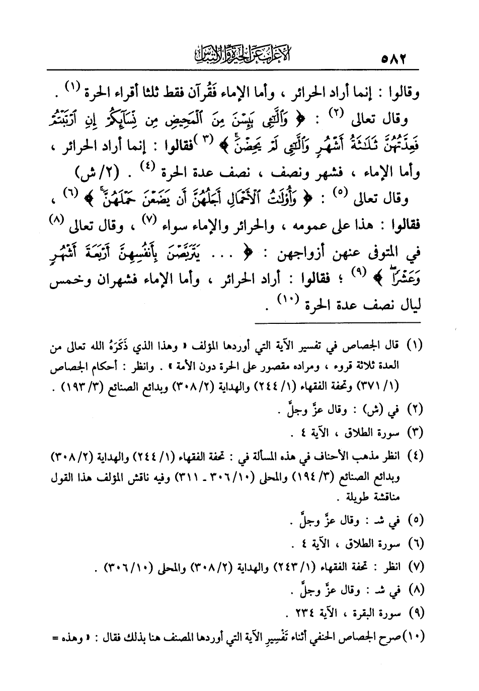 (¬١) قال الجصاص في تفسير الآية التي أوردها المؤلف "وهذا الذي ذَكرَهُ الله تعالى من العدة ثلاثة قروء، ومراده مقصور على الحرة دون الأمة". وانظر: أحكام الجصاص (١/ ٣٧١) وتحفة الفقهاء (١/ ٢٤٤) والهداية (٢/ ٣٠٨) وبدائع الصنائع (٣/ ١٩٣).