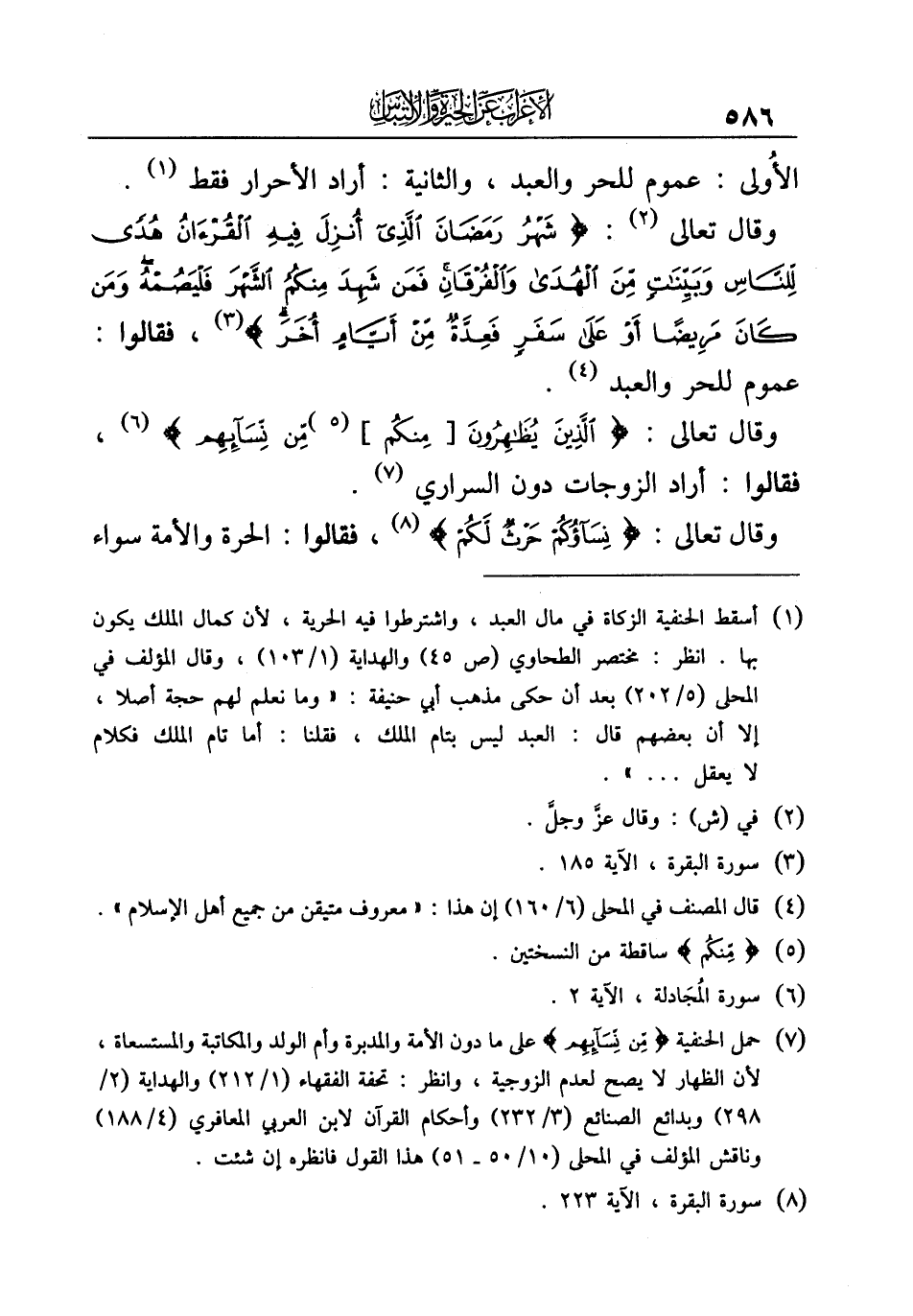 (¬٧) حمل الحنفية {مِنْ نِسَائِهِمْ} على ما دون الأمة والمدبرة وأم الولد والمكاتبة والمستسعاة، لأن الظهار لا يصح لعدم الزوجية، وانظر: تحفة الفقهاء (١/ ٢١٢) والهداية (٢/ ٢٩٨) وبدائع الصنائع (٣/ ٢٣٢) وأحكام القرآن لابن العربي المعافري (٤/ ١٨٨) وناقش المؤلف في المحلى (١٠/ ٥٠ - ٥١) هذا القول فانظره إن شئت.