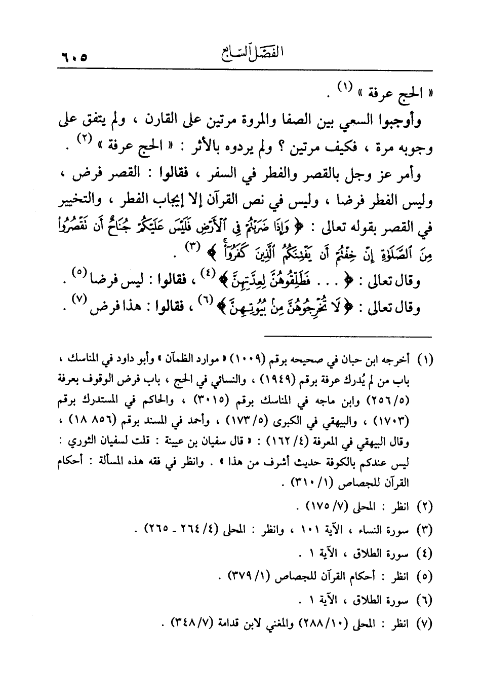 (¬١) أخرجه ابن حبان في صحيحه برقم (١٠٠٩) "موارد الظمآن، وأبو داود في المناسك، باب من لم يُدرك عرفة برقم (١٩٤٩)، والنسائي في الحج، باب فرض الوقوف بعرفة (٥/ ٢٥٦) وابن ماجه في المناسك برقم (٣٠١٥)، والحاكم في المستدرك برقم (١٧٠٣)، والبيهقي في الكبرى (٥/ ١٧٣)، وأحمد في المسند برقم (١٨٨٥٦)، وقال البيهقي في المعوفة (٤/ ١٦٢): "قال سفيان بن عيينة: قلت لسفيان الثوري: ليس عندكم بالكوفة حديث أشرف من هذا". وانظر في فقه هذه المسألة: أحكام القرآن للجصاص (١/ ٣١٠).