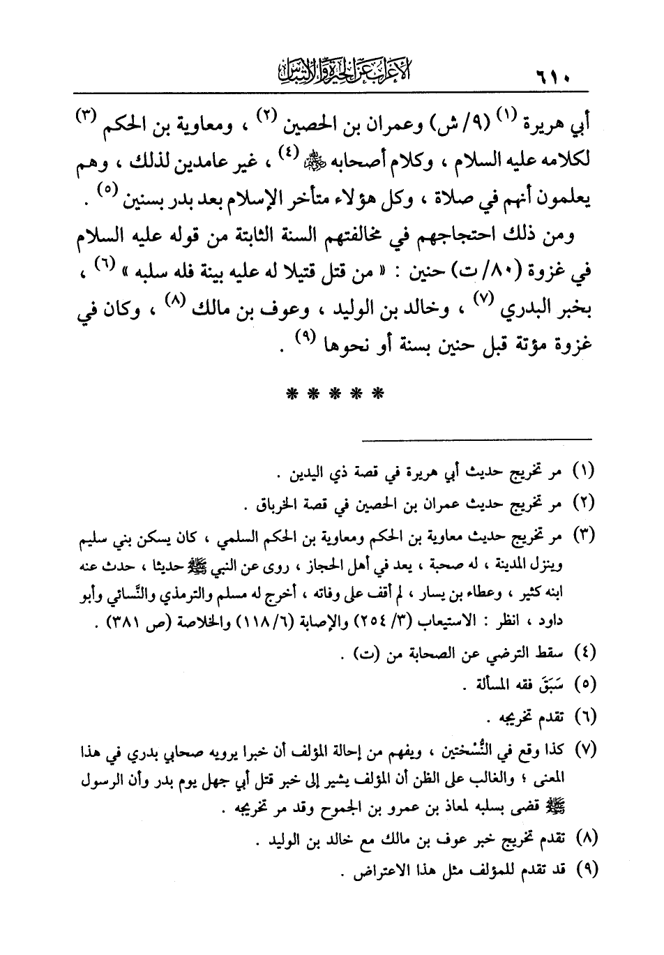 (¬٧) كذا وقع في النُّسْختين، ويفهم من إحالة المؤلف أن خبرا يرويه صحابي بدري في هذا المعنى؛ والغالب على الظن أن المؤلف يشير إلى خبر قتل أبي جهل يوم بدر وأن الرسول - صلى الله عليه وسلم - قضى بسلبه لمعاذ بن عمرو بن الجموح وقد مر تخريجه.