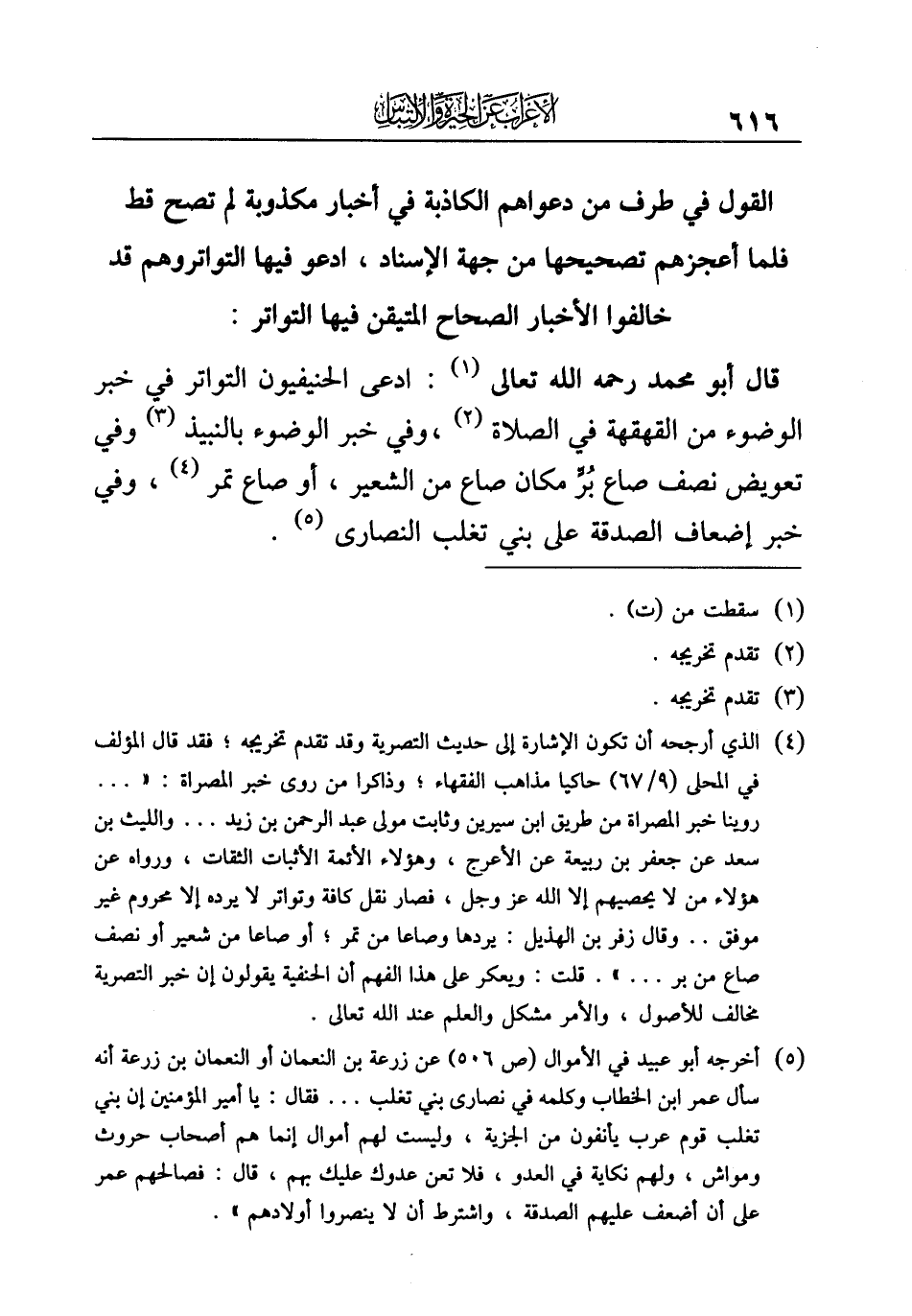 قال أبو محمد رحمه الله تعالى (¬١): ادعى الحنيفيون التواتر في خبر الوضوء من القهقهة في الصلاة (¬٢)، وفي خبر الوضوء بالنبيذ (¬٣) وفي تعويض نصف صاع بُرٍّ مكان صاع من الشعير، أو صاع تمر (¬٤)، وفي خبر إضعاف الصدقة علي بني تغلب النصارى (¬٥).