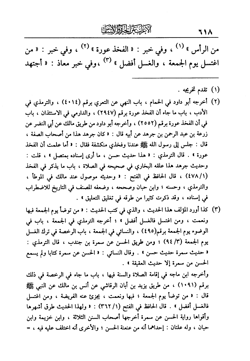 (¬٢) أخرجه أبو داود في الحمام، باب النهي عن التعري برقم (٤٠١٤)، والترمذي في الأدب، باب ما جاء أن الفخذ عورة برقم (٢٩٤٧)، والدارمي في الاستئذان، باب في أن الفخذ عورة برقم (٢٥٥٢)، وأخرجه أبو داود من طريق مالك عن أبي النضر عن زرعة بن عبد الرحمن بن جرهد عن أبيه قال: "كان جرهد هذا من أصحاب الصفة، قال: جلس إلى رسول الله - صلى الله عليه وسلم - عندنا وفخذي منكشفة فقال: "أما علمت أن الفخذ عورة". قال الترمذي: "هذا حديث حسن، ما أرى إسناده بمتصل"، قلت: وحديث جرهد هذا علقه البخاري في صحيحه في الصلاة، باب ما يذكر في الفخذ (١/ ٤٧٨)، قال الحافظ في الفتح: "وحديثه موصول عند مالك في الموطأ، والترمذي، وحسنه؛ وابن حبان وصححه، وضعفه المصنف في التاريخ للاضطراب في إسناده، وقد ذكرت كثيرا من طرقه في تغليق التعليق".