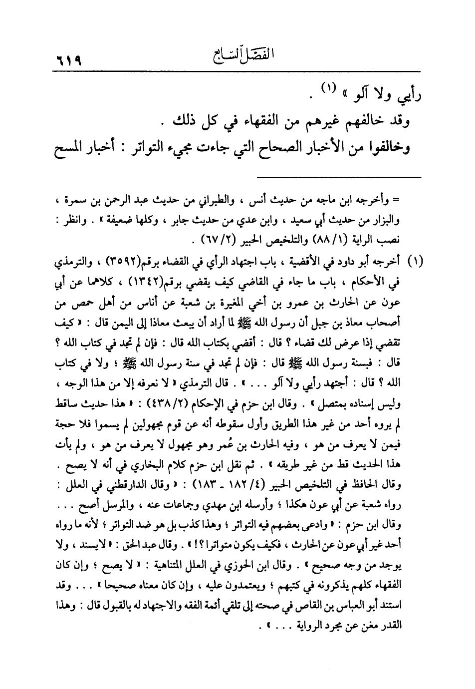 (¬١) أخرجه أبو داود في الأقضية، باب اجتهاد الرأي في القضاء برقم (٣٥٩٢)، والترمذي في الأحكام، باب ما جاء في القاضي كيف يقضي برقم (١٣٤٢)، كلاهما عن أبي عون عن الحارث بن عمرو بن أخي المغيرة بن شعبة عن أناس من أهل حمص من أصحاب معاذ بن جبل أن رسول الله - صلى الله عليه وسلم - لما أراد أن يبعث معاذا إلى اليمن قال: "كيف تقضي إذا عرض لك قضاء؟ قال: أقضي بكتاب الله قال: فإن لم تجد في كتاب الله؟ قال: فبسنة رسول الله - صلى الله عليه وسلم - قال: فإن لم تجد في سنة رسول الله - صلى الله عليه وسلم -؛ ولا في كتاب الله؟ قال: أجتهد رأيي ولا آلو ... ". قال الترمذي "لا نعرفه إلا من هذا الوجه، وليس إسناده بمتصل". وقال ابن حزم في الإحكام (٢/ ٤٣٨): "هذا حديث ساقط لم يروه أحد من غير هذا الطريق وأول سقوطه أنه عن قوم مجهولين لم يسموا فلا حجة فيمن لا يعرف من هو، وفيه الحارث بن عُمر وهو مجهول لا يعرف من هو، ولم يأت هذا الحديث قط من غير طريقه". ثم نقل ابن حزم كلام البخاري في أنه لا يصح. وقال الحافظ في التلخيص الحبير (٤/ ١٨٢ - ١٨٣): "وقال الدارقطني في العلل: رواه شعبة عن أبي عون هكذا؛ وأرسله ابن مهدي وجماعات عنه، والمرسل أصح ... وقال ابن حزم: "وادعى بعضهم فيه التواتر؛ وهذا كذب بل هو ضد التواتر؛ لأنه ما رواه أحد غير أبي عون عن الحارث، فكيف يكون متواترا؟ ! ". وقال عبد الحق: "لا يسند، ولا يوجد من وجه صحيح". وقال ابن الجوزي في العلل المتناهية: "لا يصح؛ وإن كان الفقهاء كلهم يذكرونه في كتبهم؛ ويعتمدون عليه، وإن كان معناه صحيحا" ... وقد استند أبو العباس بن القاص في صحته إلى تلقي أئمة الفقه والاجتهاد له بالقبول قال: وهذا القدر مغن عن مجرد الرواية ... ".