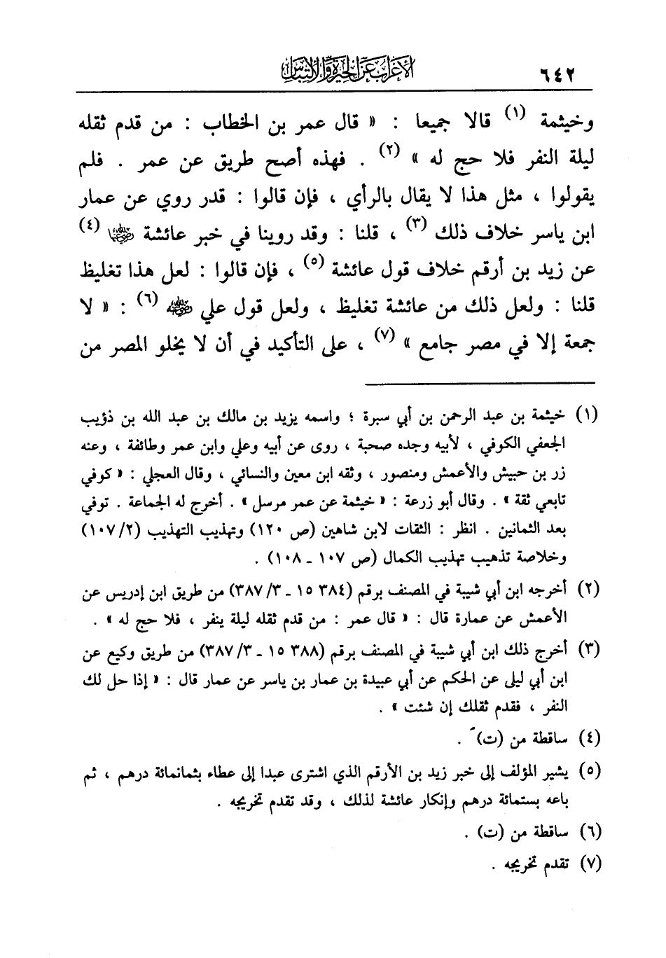 وخيثمة (¬١) قالا جميعا: "قال عمر بن الخطاب: من قدم ثقله ليلة النفر فلا حج له" (¬٢). فهذه أصح طريق عن عمر. فلم يقولوا، مثل هذا لا يقال بالرأي، فإن قالوا: قدر روي عن عمار بن ياسر خلاف ذلك (¬٣)، قلنا: وقد روينا في خبر عائشة - رضي الله عنهما - (¬٤) عن زيد بن أرقم خلاف قول عائشة (¬٥)، فإن قالوا: لعل هذا تغليظ قلنا: ولعل ذلك من عائشة تغليظ، ولعل قول علي - رضي الله عنه - (¬٦): "لا جمعة إلا في مصر جامع" (¬٧)، على التأكيد في أن لا يخلو المصر من